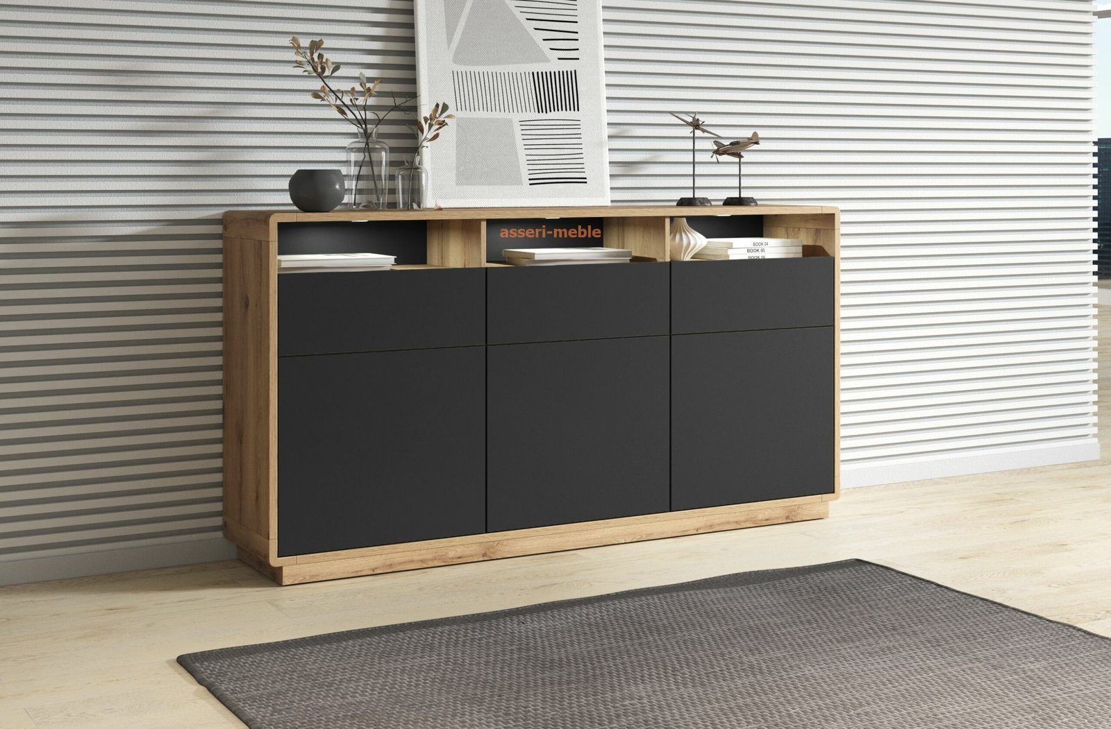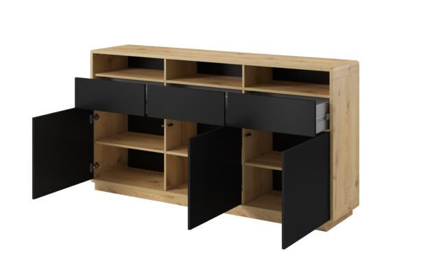 ASTON – kolekcja mebli w stylu nowoczesnym. Elegancka matowa czerń otoczona jasnym dębem, a do tego bezpieczne zaokrąglenia pozwolą urządzić każdy salon w niebanalnym stylu