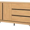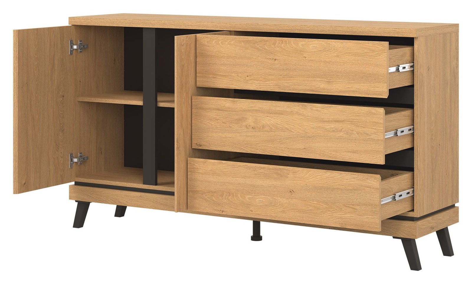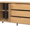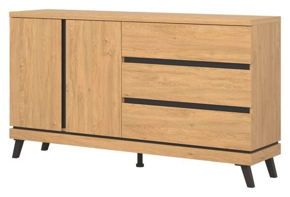 Komoda ATE 03 o uniwersalnym zastosowaniu wyposażona została w trzy szuflady przestronną szafkę z jedna półką, która umożliwi dobrą organizację dla potrzebnych drobiazgów. Duża powierzchnia blatu pozwoli na wyeksponowanie dekoracji. Kolekcja ATE utrzymana jest w modnym kolorze dąb kamienny, który w połączeniu z czarnymi wstawkami zapewnia kontrastowe połączenie, które przyciąga uwagę i nadaje pomieszczeniu elegancji. Mebel otwiera się za pomocą specjalnie wyprofilowanych żłobień na obrzeżu frontu.
