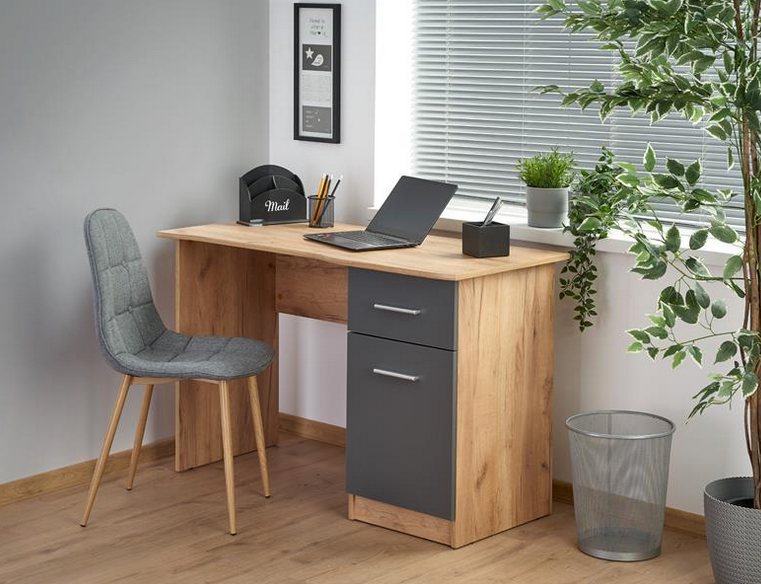 Atrakcyjne biurko MALMO doskonale sprawdzi się w pokoju dziecięcym lub młodzieżowym, stanowiąc komfortowe miejsce do nauki czy zabawy. Wbudowany kontenerek z szufladą i szafką zapewni sporo miejsca do przechowywania zeszytów i akcesoriów szkolnych. Wykonane jest z płyty meblowej laminowanej. Korpus oraz blat wykonane są w kolorze dąb kraft, zaś fronty w wybarwieniu antracyt..