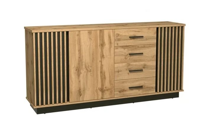 Kolekcja BLACK-WOTAN to doskonała propozycja do każdego salonu, pokoju dziennego czy pokoju młodzieżowego. Meble charakteryzują się nowoczesnym i eleganckim designem. Wniosą do każdego wnętrza ciekawy wygląd, który zachwyci każdego. Korpus systemu wykonany jest w kolorze dąb wotan, natomiast fronty to połączenie dąb wotan z czarnym matem, które doskonale ze sobą współgrają. Lamele zastosowane na frontach wykonano z płyty MDF. Część frontów otwierana jest bezuchwytowo, a część posiada uchwyty wykonane z materiału PCV. Połączenie pionowych listew z frontami mebli to nowoczesne i szykowne zestawienie.