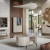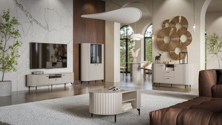 CONVEX to kolekcja mebli wpisująca się w najnowsze trendy jednocześnie pozostając wyjątkowo funkcjonalną. Niepowtarzalne wzornictwo sprawi, że będzie kolekcją zdobiącą każde wnętrze. Ryflowane fronty w stylu GLAMOUR nadają wyrafinowanego smaku a złote czy czarne uchwyty oraz nóżki dodają lekkości i pozwalają na sprzątanie I-ROBOTEM. Kolekcja charakteryzuje się zaokrąglonymi bokami wykonanymi z MDF oraz tyłem wykonanym z płyty, co umożliwia ich ustawienie w centralnym punkcie pomieszczenia.