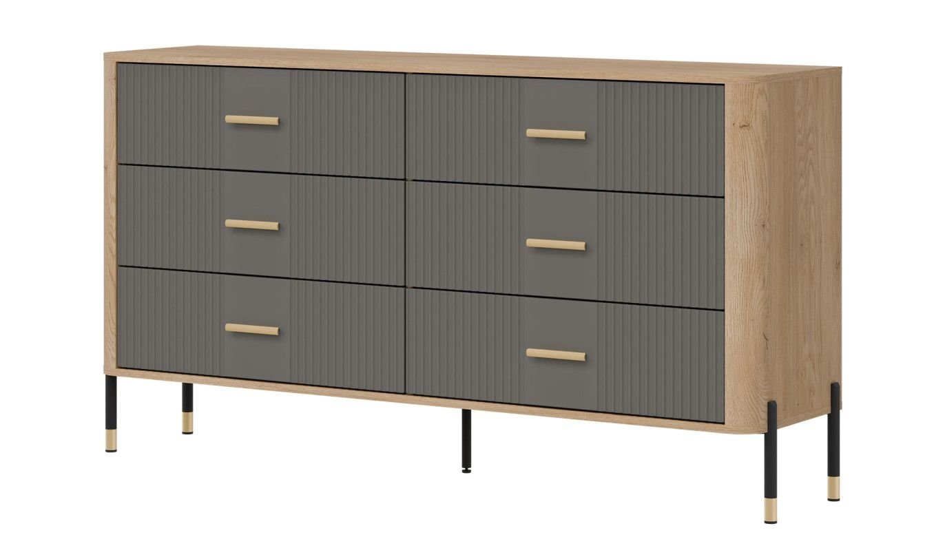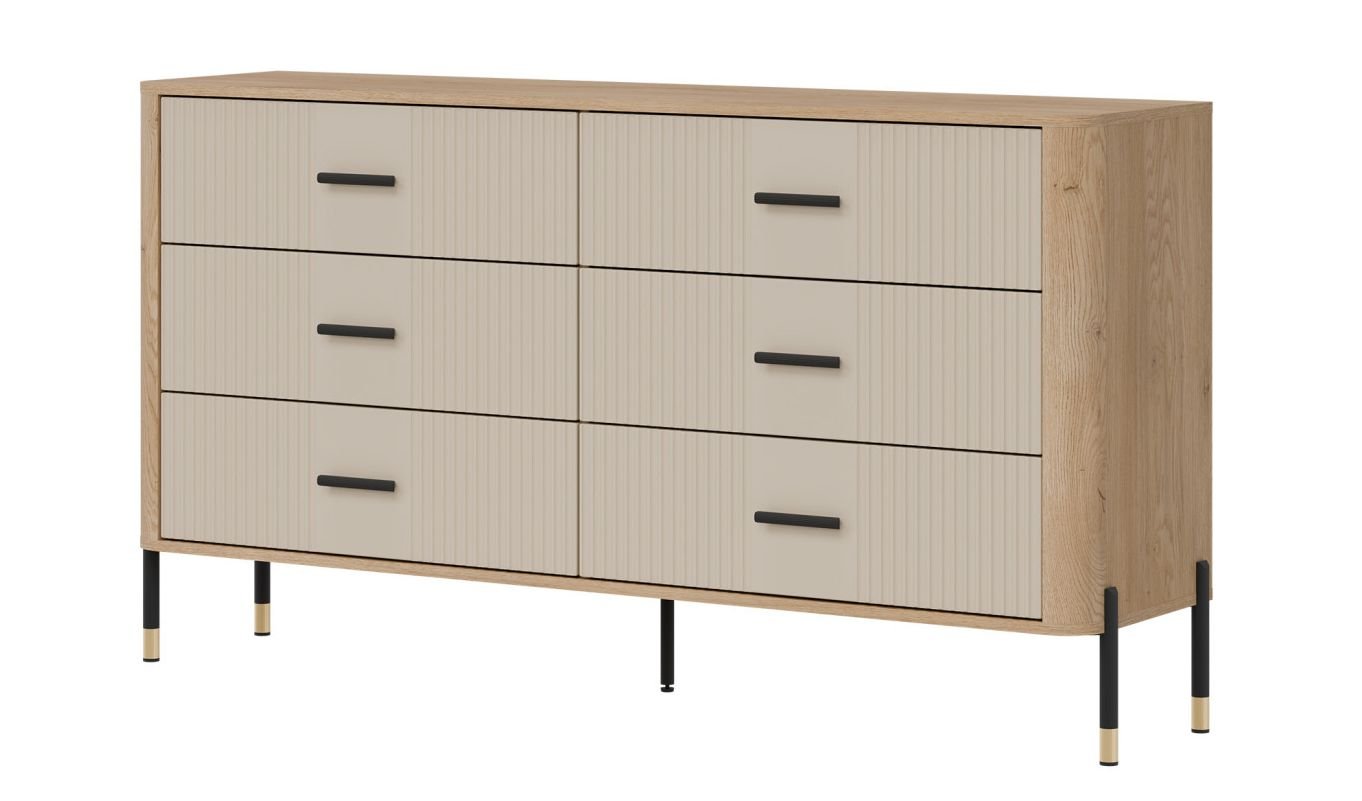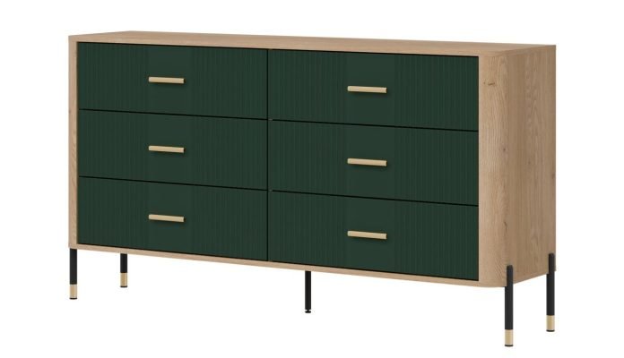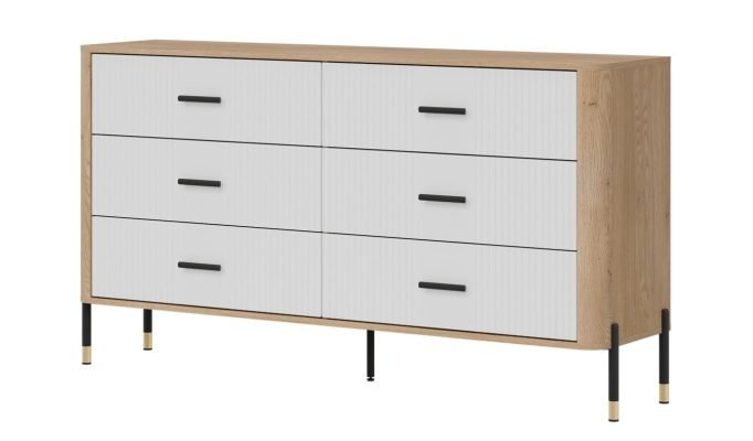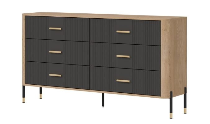 Złote lub czarne uchwyty i detale na nogach dodają całości elegancji i lekkości, doskonale wpisując się w klimat nowoczesnych, loftowych i skandynawskich aranżacji. Designerski akcent, który przyciąga wzrok, solidna konstrukcja na metalowych nogach ze złotym wykończeniem – stabilność i styl w jednym gwarantujące komfort użytkowania i luksusowy wygląd