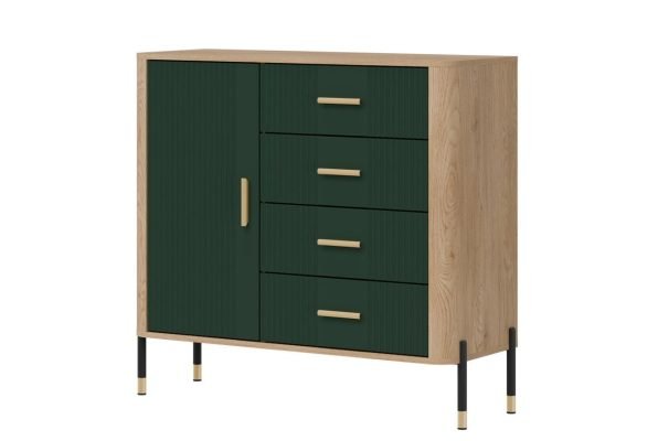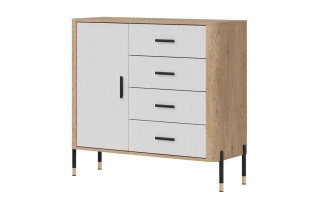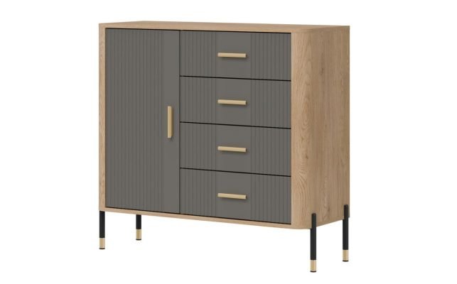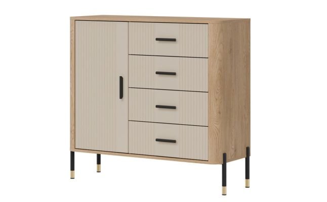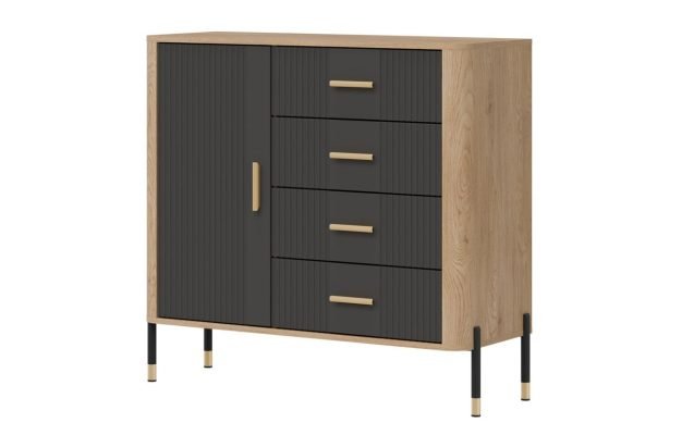 Złote lub czarne uchwyty i detale na nogach dodają całości elegancji i lekkości, doskonale wpisując się w klimat nowoczesnych, loftowych i skandynawskich aranżacji. Designerski akcent, który przyciąga wzrok, solidna konstrukcja na metalowych nogach ze złotym wykończeniem – stabilność i styl w jednym gwarantujące komfort użytkowania i luksusowy wygląd
