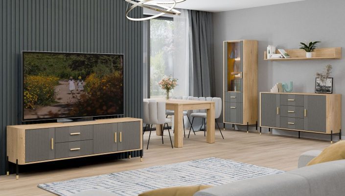 Kolekcja DANTE. Elegancja w nowoczesnym wydaniu. Wprowadź do swojego wnętrza harmonię stylu i funkcjonalności. To zestaw mebli, który zachwyca nie tylko designem, ale i praktycznością. Połączenie naturalnego dekoru dębu z matowymi, ryflowanymi frontami w pięciu wariantach kolorystycznych do wyboru, tworzy wyjątkowy kontrast – subtelny, a zarazem wyrazisty.