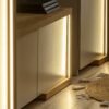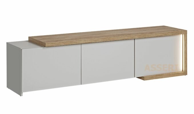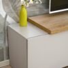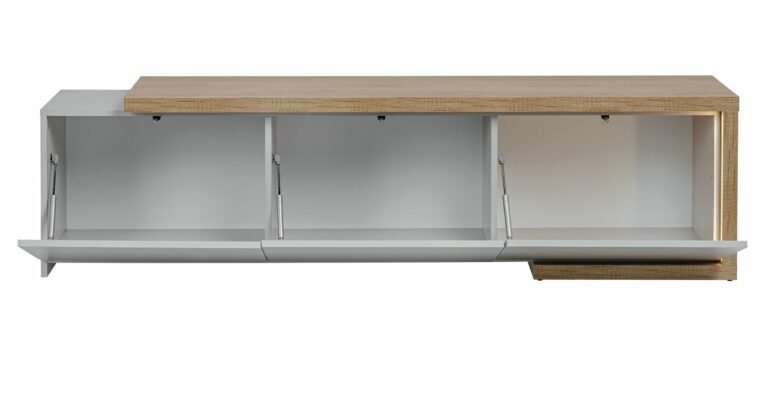 Nowoczesna szafka RTV świetnie pasuje do minimalistycznego wystroju, wnosząc nieco uroku dzięki blatowi w kolorze dębu. Oferuje funkcjonalność dzięki zamkniętym schowkom oraz zapewni Ci relaks i możliwość pełnego wykorzystania wnętrza.