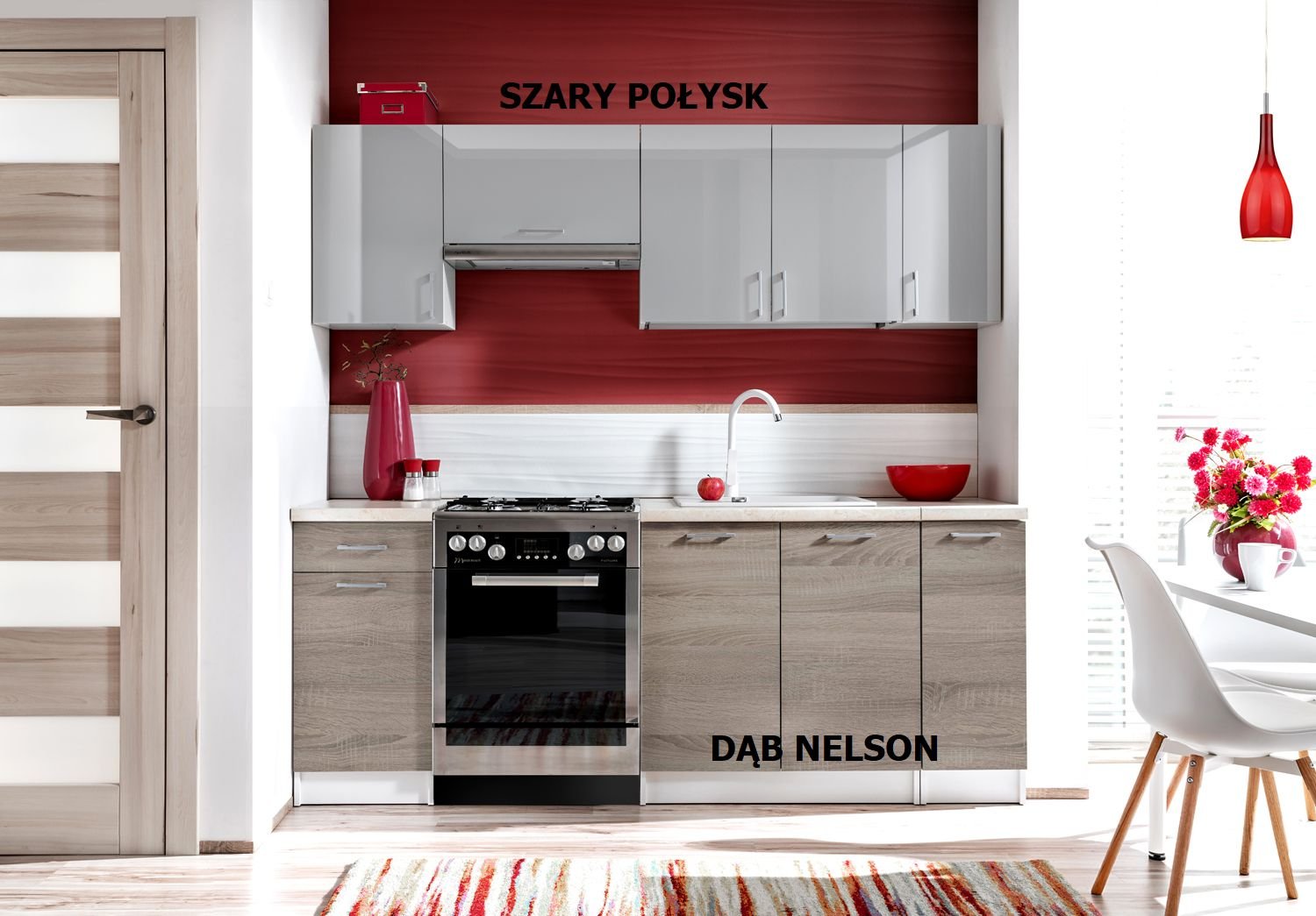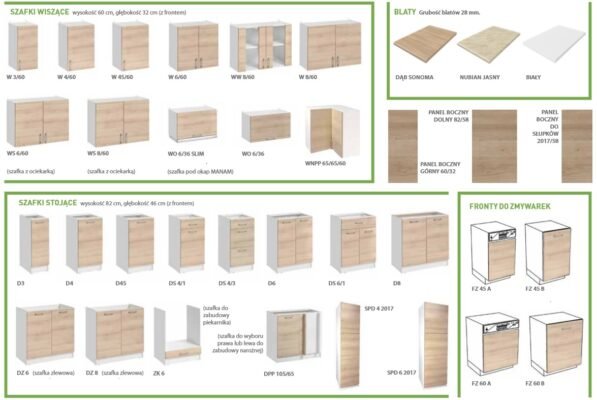 W skład zestawu wchodzą następujące szafki: (górne połysk, dolne drewnopodobne)