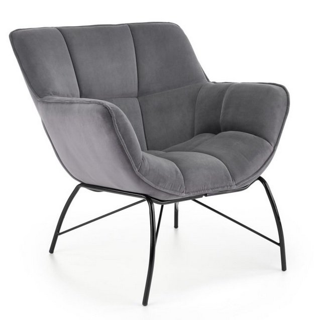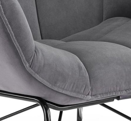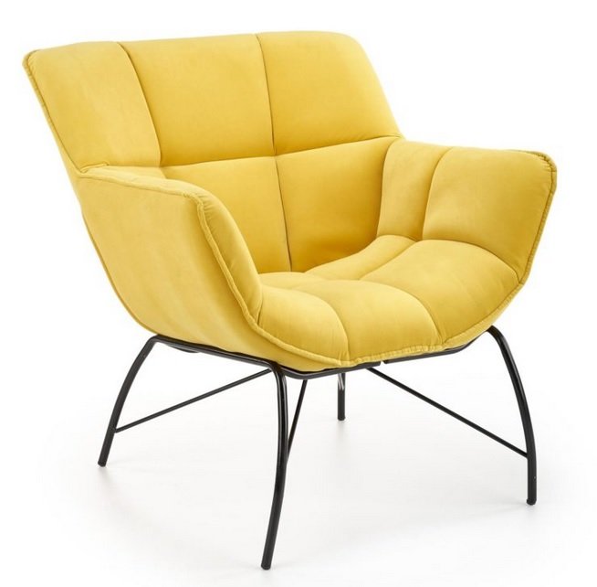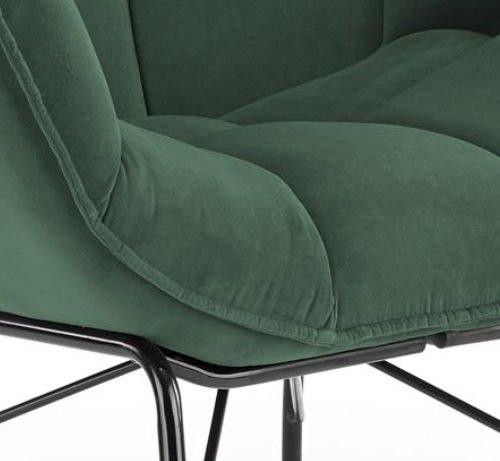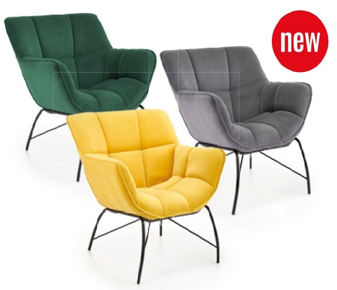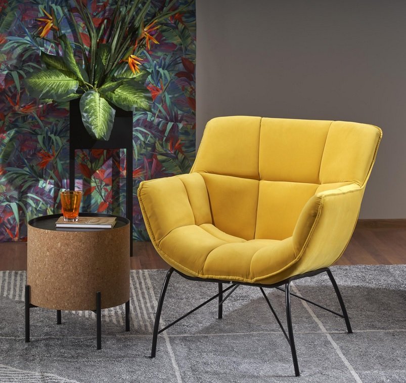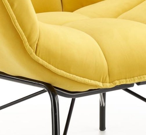 Oryginalne przeszycia świetnie prezentują się na przyjemnej, aksamitnej tkaninie Velvet dostępnej w trzech kolorach do wyboru: żółtym, ciemnozielonym i szarym, a designerski, czarny stelaż wnosi do pomieszczenia powiew świeżości. Fotel najlepiej prezentuje się w pokoju dziennym, salonie czy sypialni. Wysoka jakość materiałów i wygodne siedzisko zapewniają duży komfort codziennego relaksu.