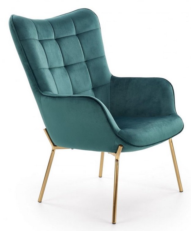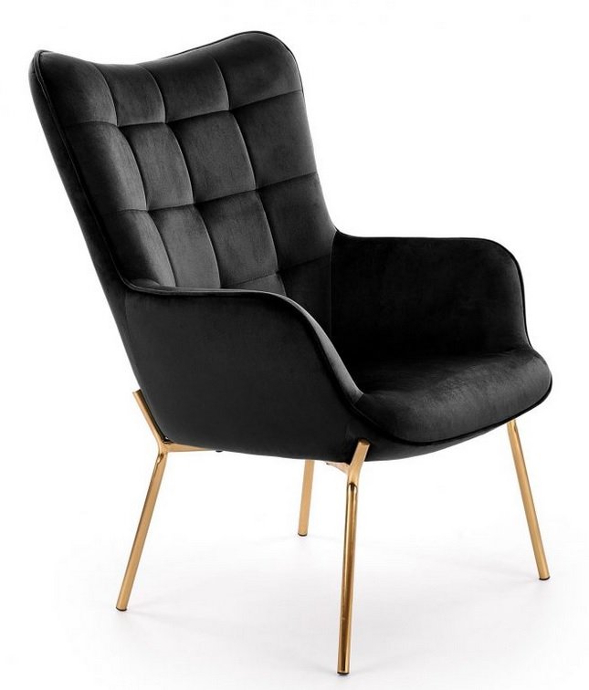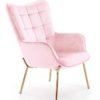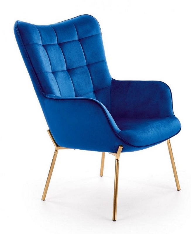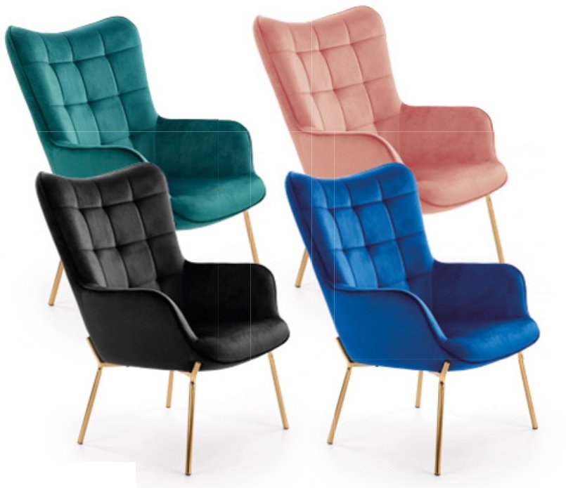 Profilowane nogi sporządzone zostały ze stali chromowanej. Są wytrzymałe, zapewniają fotelowi odpowiednią stabilność, a ich złoty kolor znakomicie komponuje się z aksamitną tapicerką.