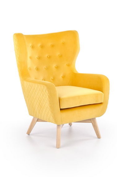 Fotel Marvel musztardowy to wygodny, tapicerowany fotel do salonu lub pokoju dziennego, którego cechuje elegancja i wyjątkowy styl.