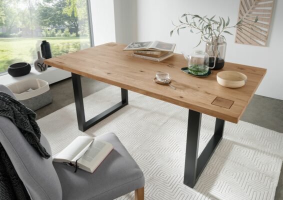 Stół FURNI został zainspirowany stylem loftowym oraz industrialnym. Posiada masywny, dębowy blat na stabilnej, metalowej podstawie. Oryginalnym elementem są kwadraty wycięte z końce belek i umiejscowione w dwóch rogach stołu. Blat stołu zabezpieczany jest specjalnym olejem.