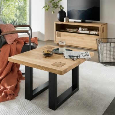 Kwadratowy stolik kawowy 70×70 to oryginalny i praktyczny mebel. Solidny blat z litego drewna dębowego oraz podstawa, również dębowa, malowana na czarno. Przykuwającym uwagę elementem są dwa kwadraty na blacie, wycinane z końca belek. Stabilny i wytrzymały stolik na lata.