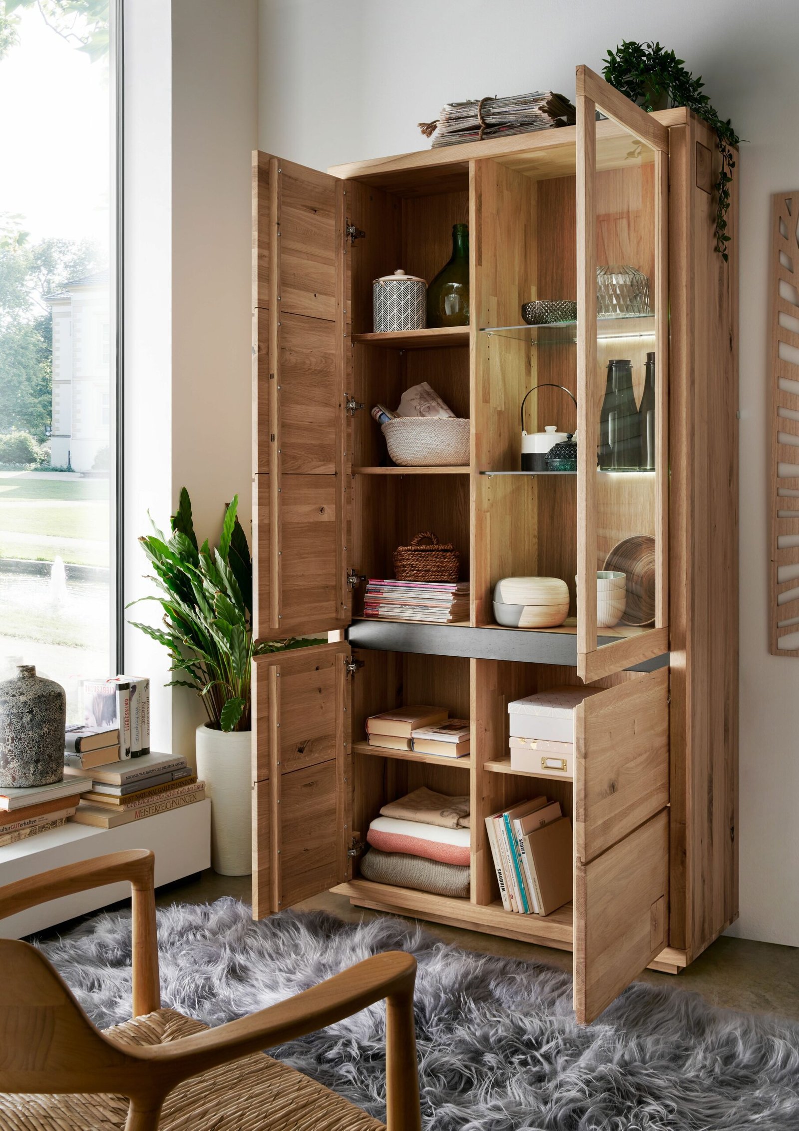 Witryna FURNI wykonana w całości z litego drewna. Klasyczną formę przełamuje czarna wstawka oraz detale wycięte z końca belek. Mebel pokrywany jest olejem, który zabezpiecza materiał i wydobywa naturalne piękno dębu. Witryna wprowadzi do wnętrza ciekawy design, idealni sprawdzi się w nowoczesnej aranżacji.