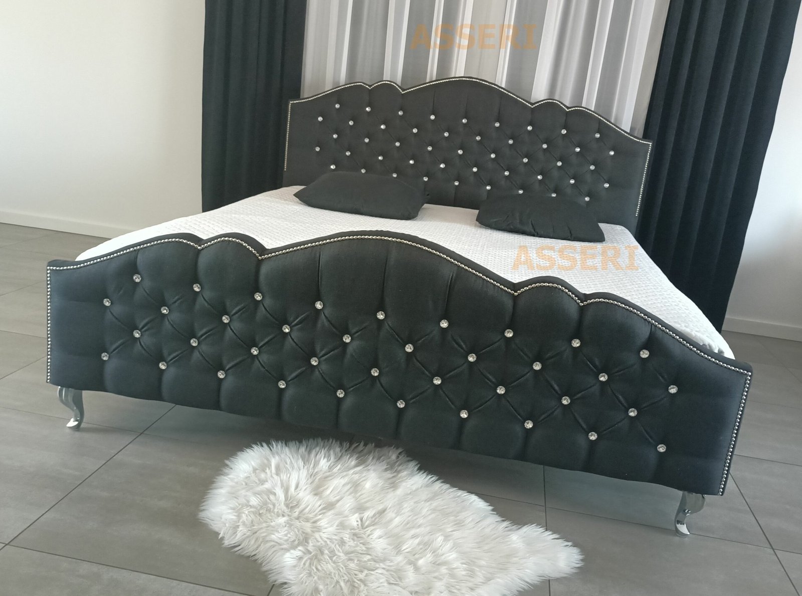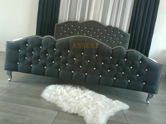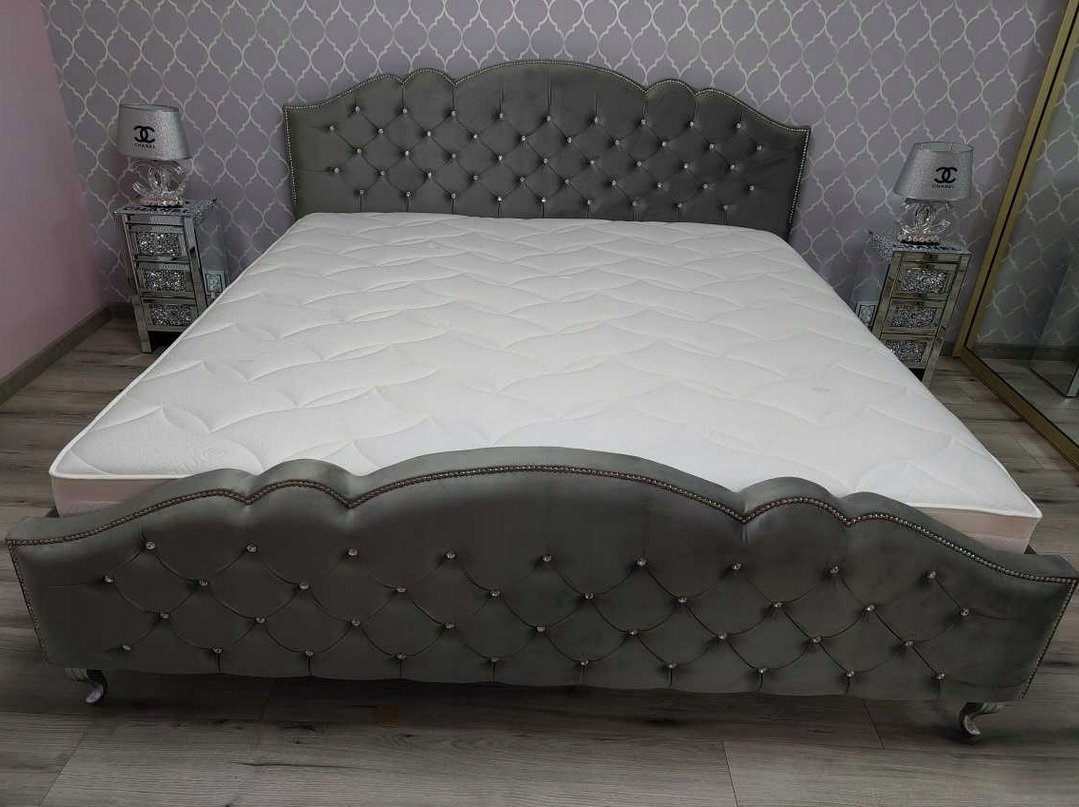 Łóżko GLAMOUR z eleganckim i wysokim wezgłowiem ozdobionym srebrnymi lub złotymi kryształkami i dodatkami. Starannie wykonane z dbałością o detale. Łóżko GLAMOUR wkomponuje się zarówno w nowoczesne jak i klasyczne wnętrze. Dostępne jest w praktycznie dowolnego rodzaju tkaninie (wykonamy również z materiału powierzonego). Łóżko posiada pojemnik na pościel pod całą powierzchnią spania, natomiast solidny metalowy stelaż na siłownikach gazowych pozwoli dotrzeć na najdalszej części pojemnika.