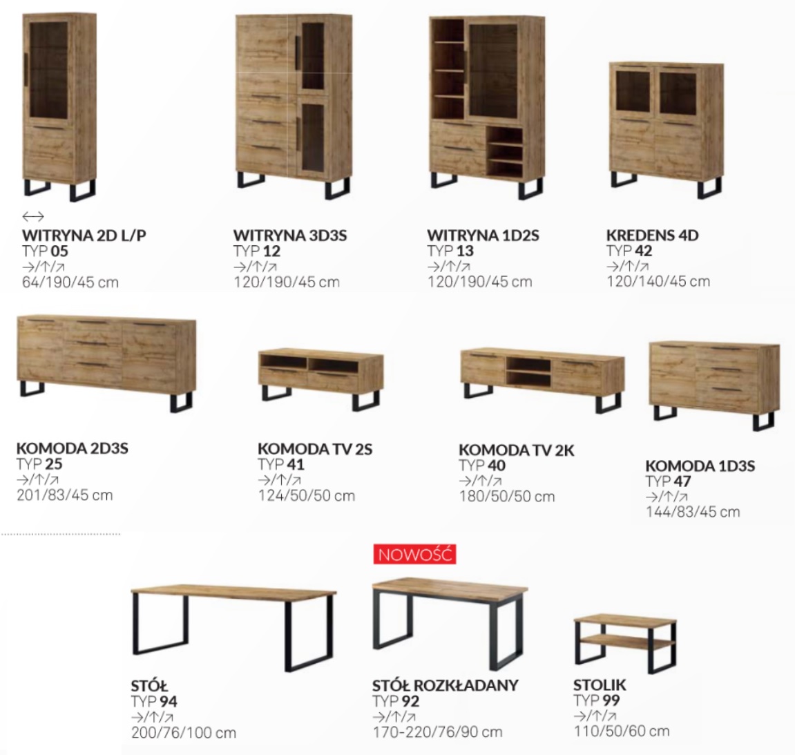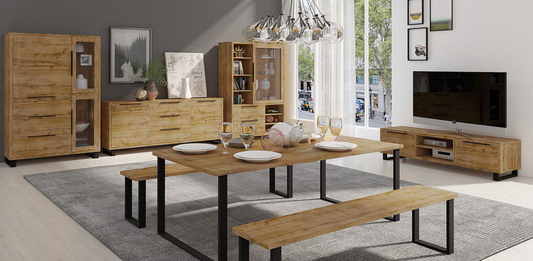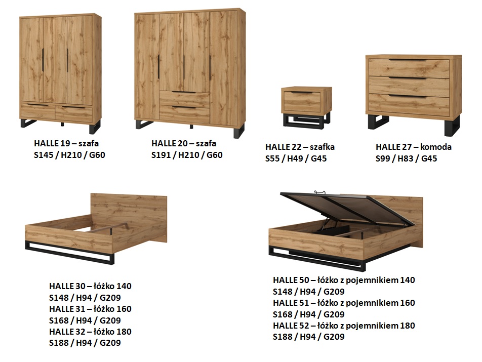 HALLE – Dla fanów współczesnych loftów i wnętrz z industrialnym polotem. Jasne wybarwienie naturalnego drewna z chłodnym metalowym wykończeniem inspirowane pofabryczną przestrzenią o surowym charakterze to duet koło którego nie można przejść obojętnie. Masywna konstrukcja została wsparta na nogach, które idealnie komponują się z innymi akcentami aranżacji LOFT.