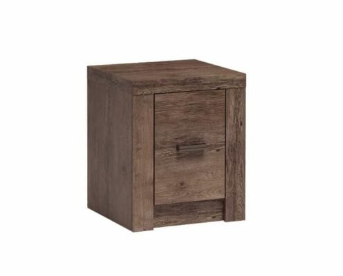 Prosta, mała i wygodna szafka nocna, idealna do sypialni. Można na nią położyć budzik, szklankę wody lub telefon. W środku znajduję się półka dzieląca przestrzeń na pół, pozwalająca na organizację. Metalowy uchwyt idealnie współgra z całością mebla.
