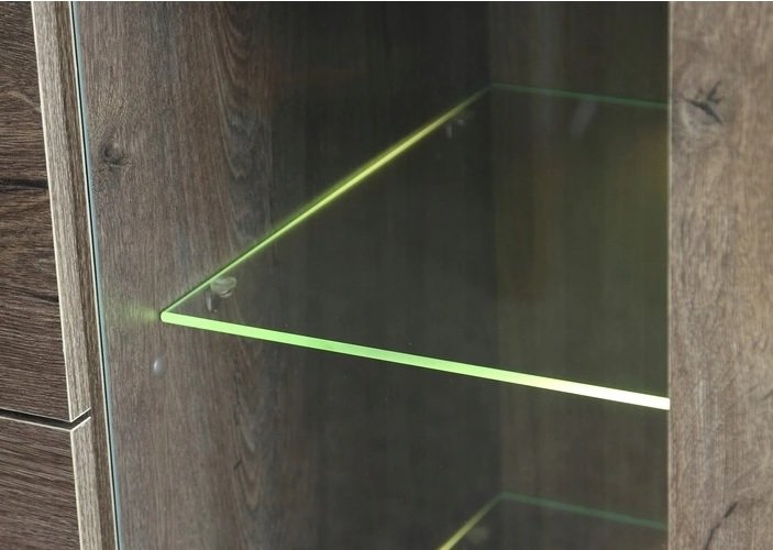 Wysoka witryna, z dwoma szklanymi półkami oraz szafką na dole z jedną półką. Do wyboru mamy front szklany, jak i pełny. Dostępna jest również opcja oświetlenia w formie LED blatu oraz półek.