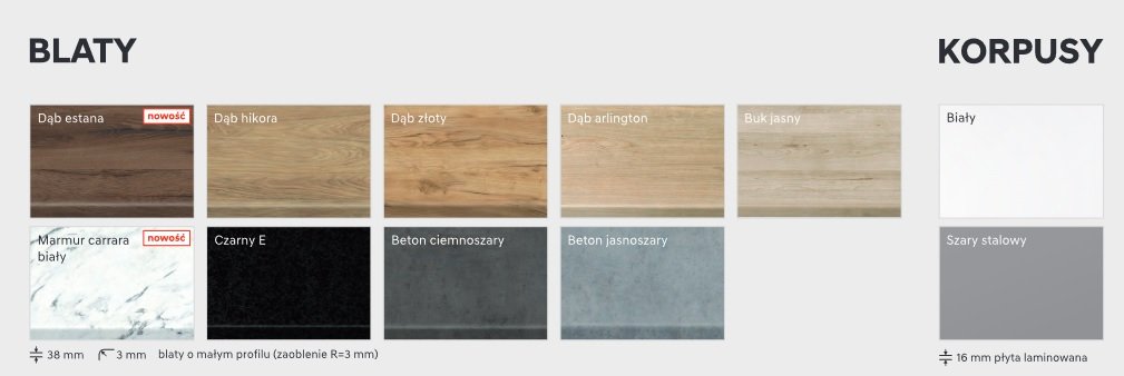 - Wszystkie szafki z kolekcji wyposażono w korpus z białej lub szarej płyty – do wyboru