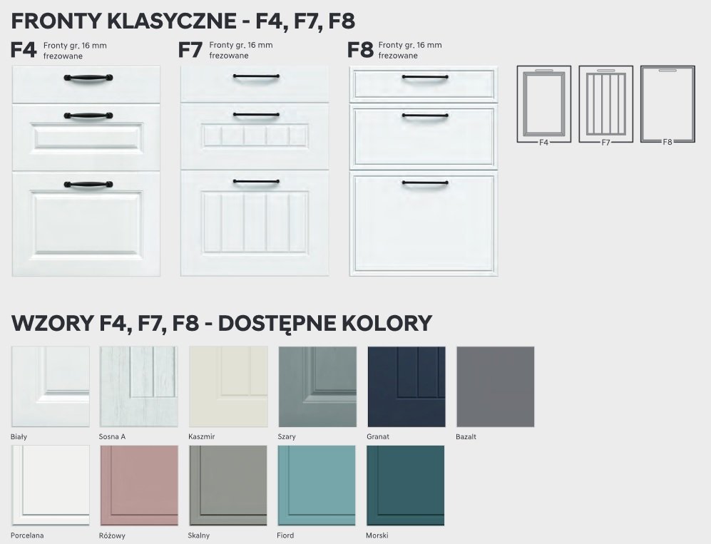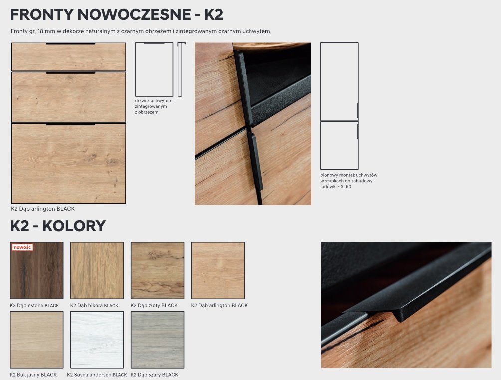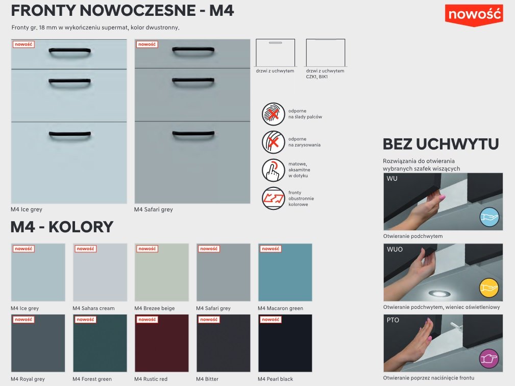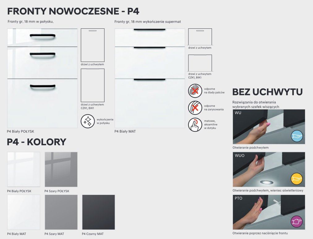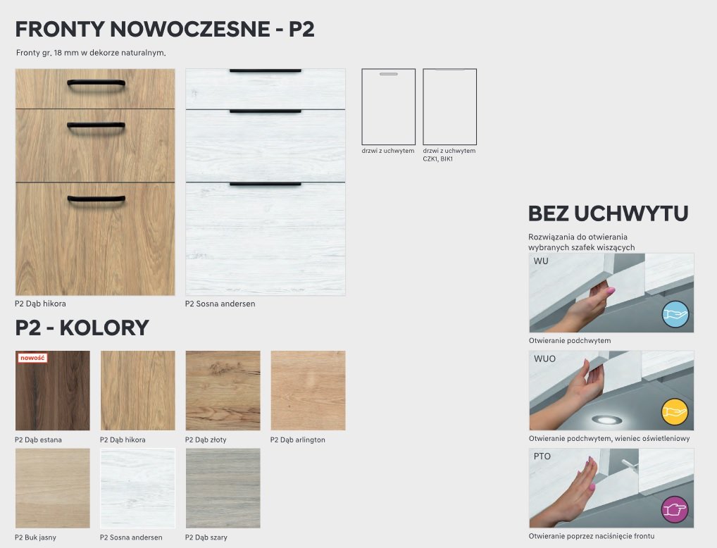 Zestaw może być wykonany w innej kolorystyce dostępnej we wzornikach frontów KAMMONO M4 oraz P2 oraz z uchwytami dostępnymi we wzorniku uchwytów KAM