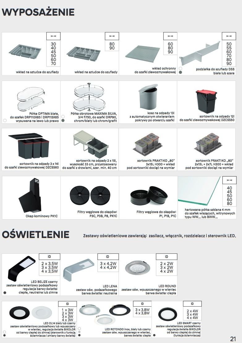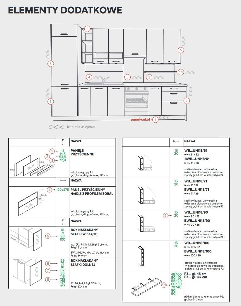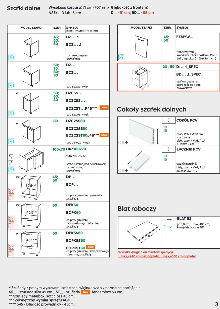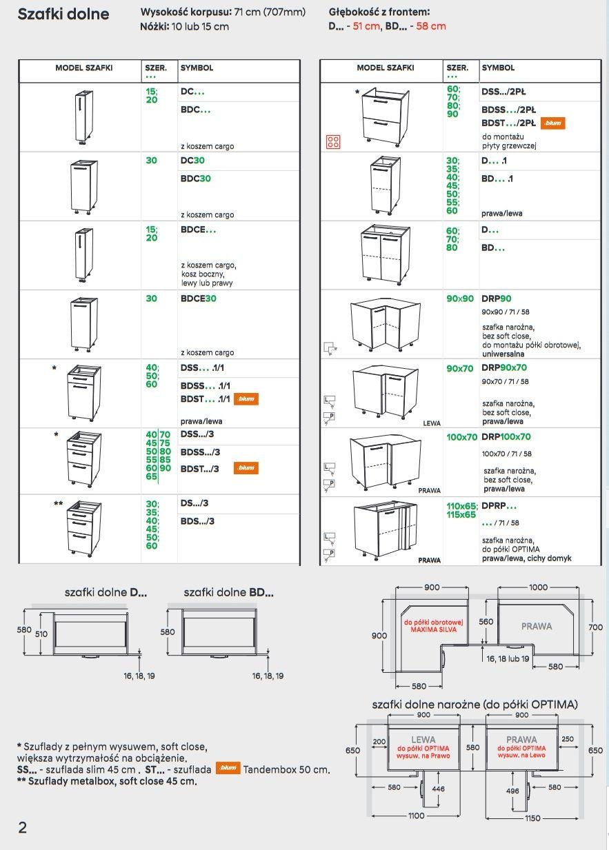 - Szafki dolne wyposażono w regulowane nóżki o wysokości 10 lub 15 cm cm