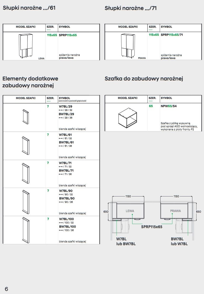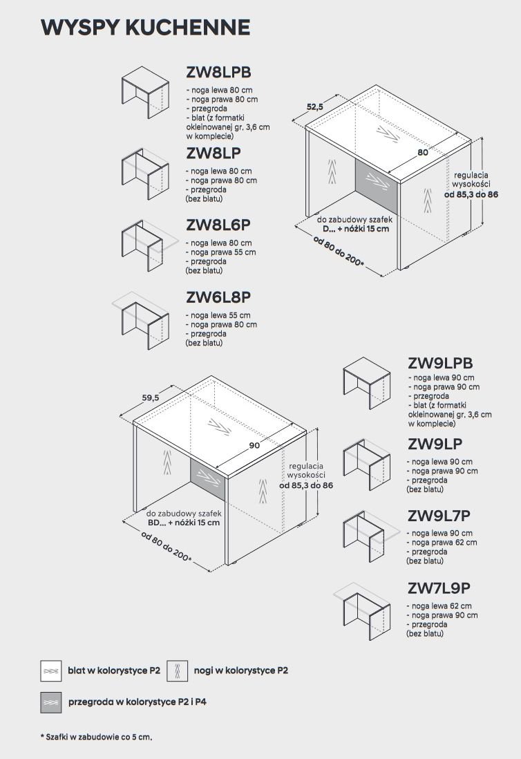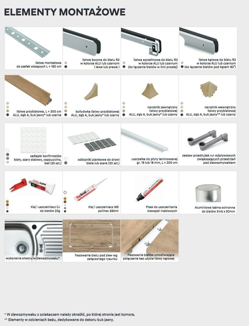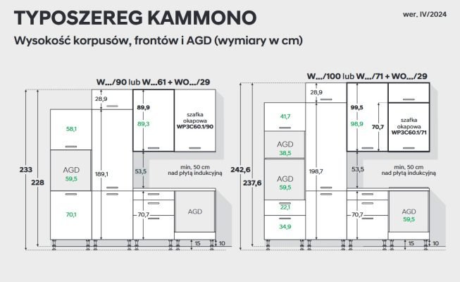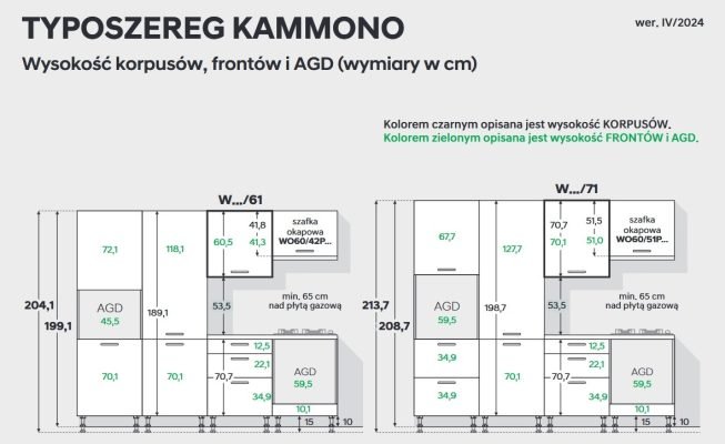 - Szafki dolne wyposażono w regulowane nóżki o wysokości 10 lub 15 cm cm