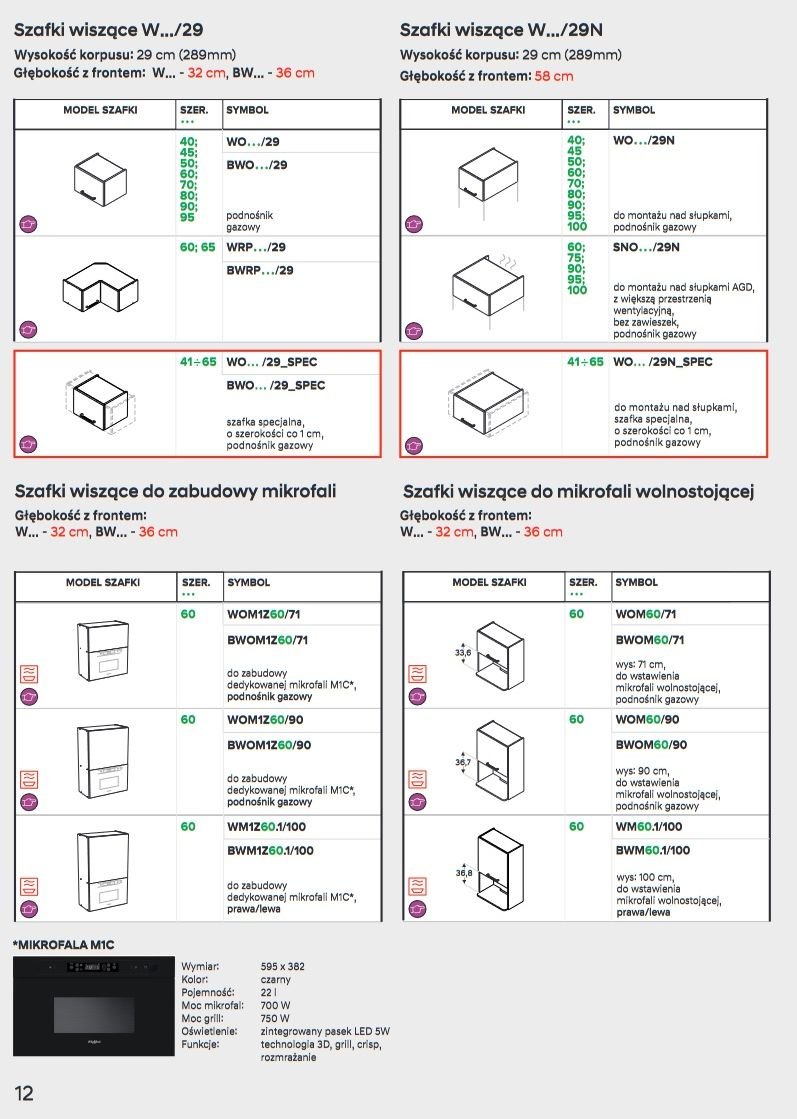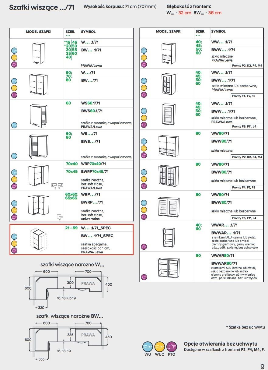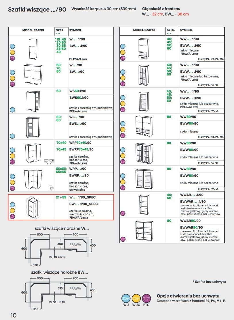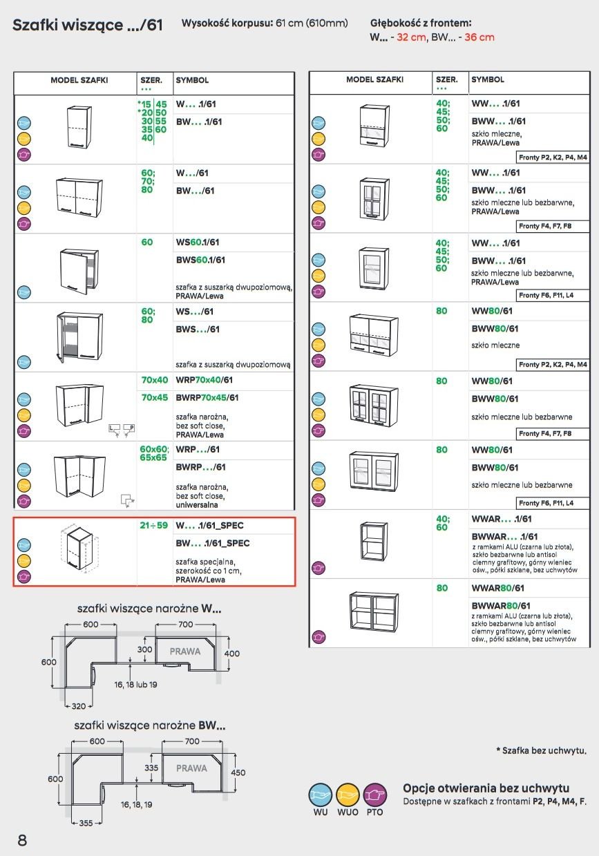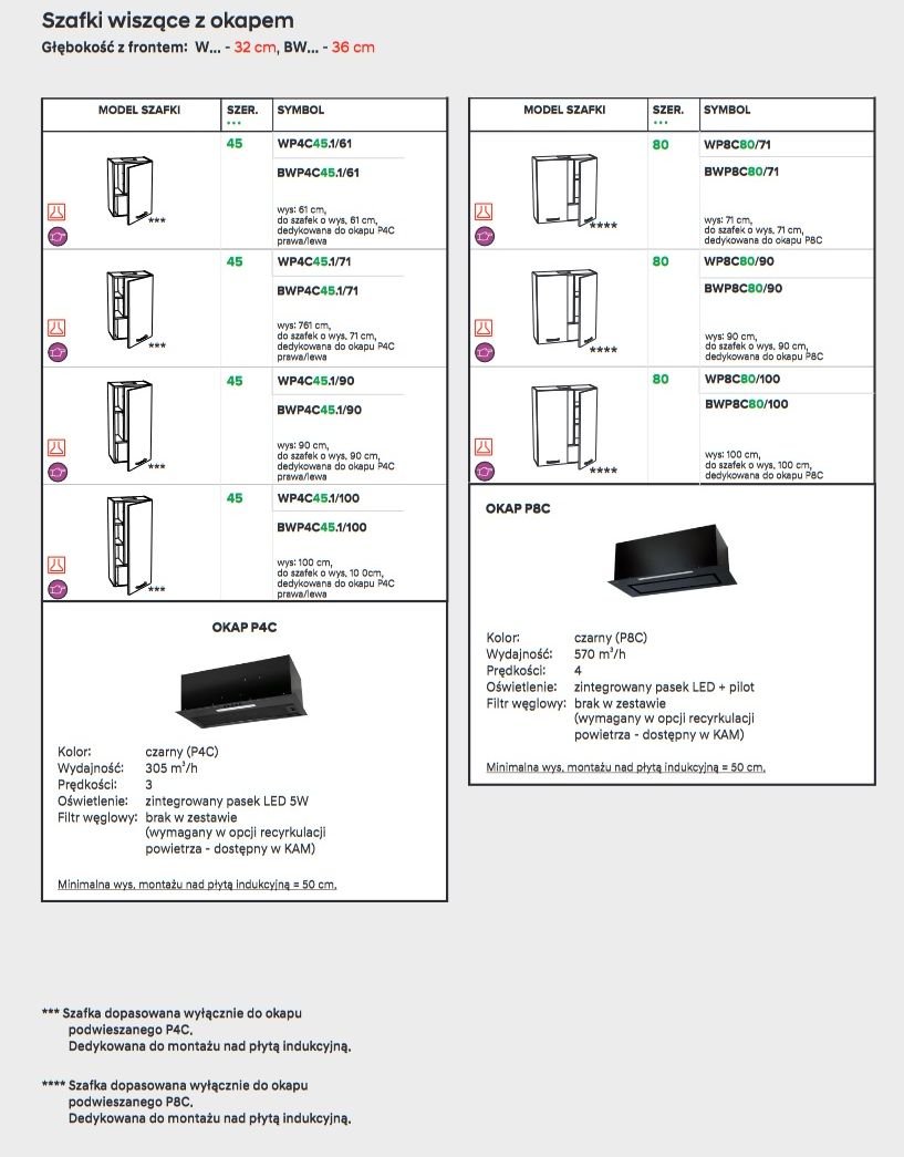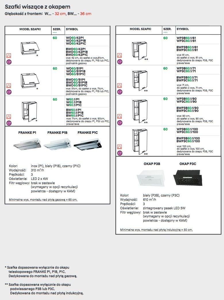 - WP3C60.1/90 – szafka wisząca z wbudowanym okapem, z 1 drzwiami, wewnątrz 2 półki, szerokość 60 cm, wysokość 89,9 cm,