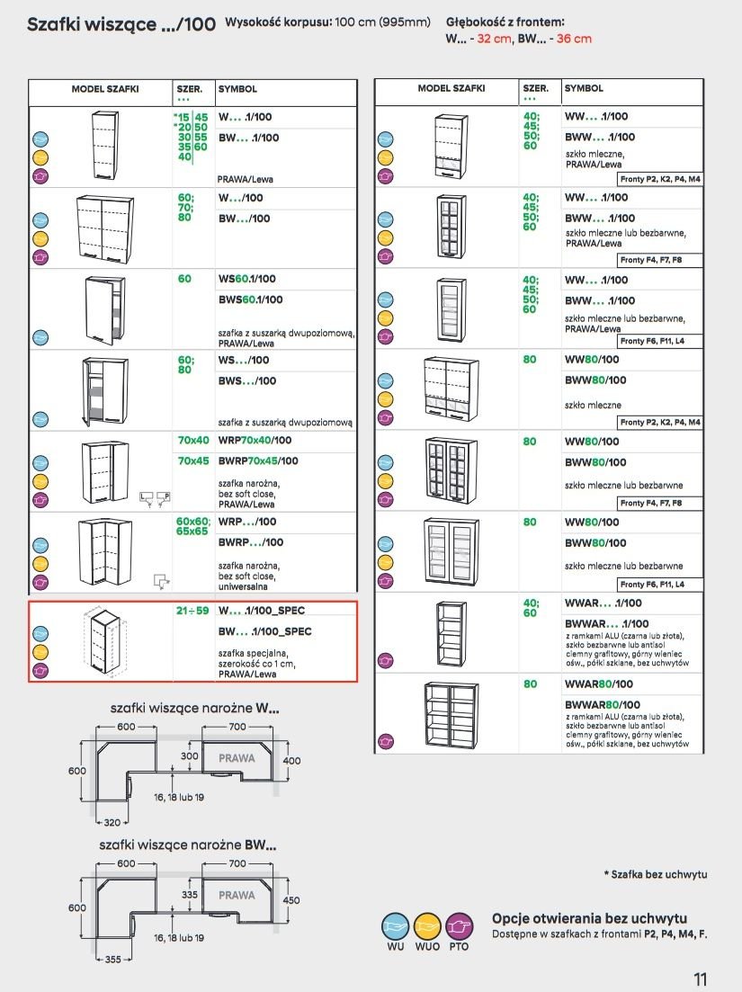 - W60.1/90 – szafka wisząca z 1 drzwiami, wewnątrz 2 półki, szerokość 60 cm, wysokość 89,9 cm,