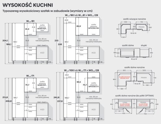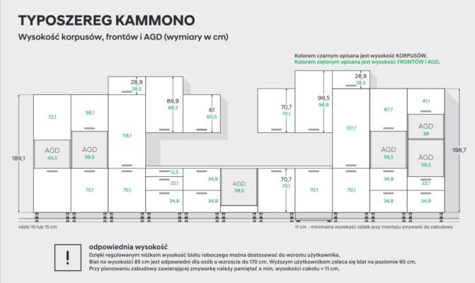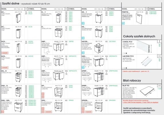 - Szafki dolne wyposażono w regulowane nóżki o wysokości 10 lub 15 cm cm