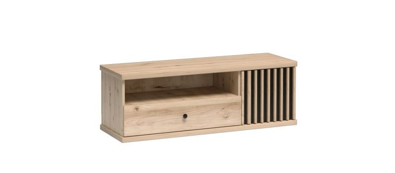 CALI-C7 Nowatorska szafka z jedną szufladą w centralnej części i jedną szafką. Naturalny kolor ARTISAN w połączeniu z czarnym frontem i lamelami. Szafka jest średniej wielkości, zmieści się w każdym salonie. Zastosowane w niej zawiasy i prowadnice z cichym domykiem nie spowodują, ze musisz martwić się czy kogoś nie obudzisz.