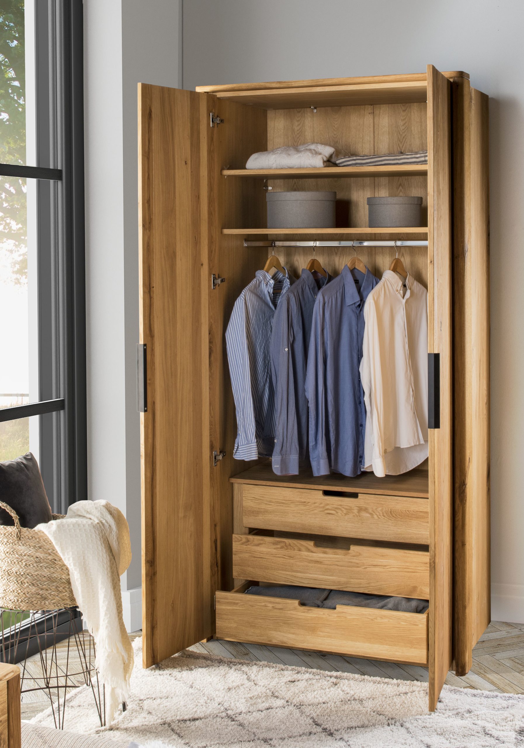 DENVER to nowość wśród mebli z litego drewna dębowego, która dzięki swojemu uniwersalnemu, nowoczesnemu designowi dopasuje się do każdego typu wnętrza. Stonowany, zaokrąglony kształt korpusów akcentowany wyrazistymi elementami, tworzy oryginalną, niepowtarzalną całość.