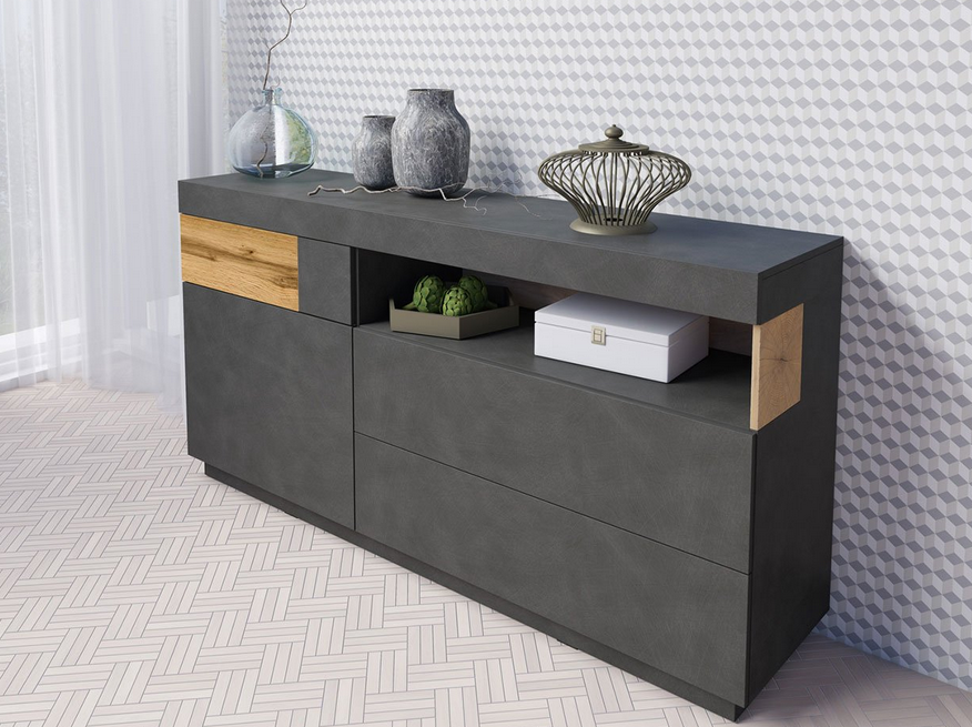 Mebel systemu producenta Helvetia wyróżniają się geometryczną formą oraz wysoką jakością wykonania na bazie odpornej na zarysowania płyty meblowej. Przeszklone witryny nadają charakteru aranżacji, tworząc ponadprzeciętny design całości. Bez-uchwytowe fronty stanowią innowacyjny walor poszczególnych mebli.