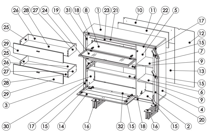 - Składowe: 1 klapa przeszklona, 2 szuflady, 1 klapa pełna, drzwi
