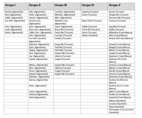 Wykaz tkanin podstawowych: