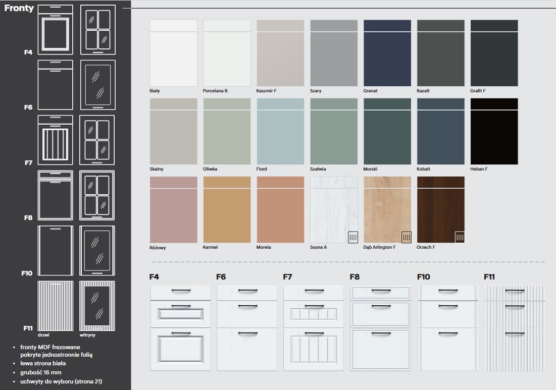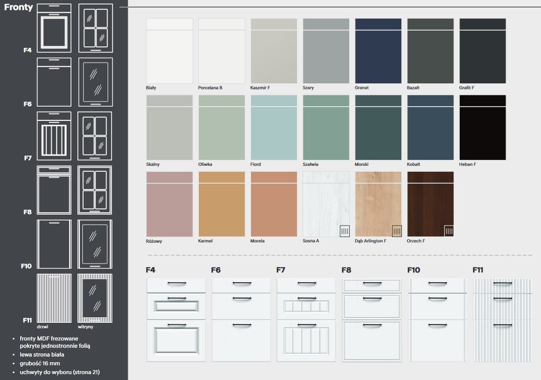 Kolorystyka frontów oraz ich rodzaje, dzięki którym możecie Państwo stworzyć swoją własną wymarzoną kuchnię.