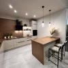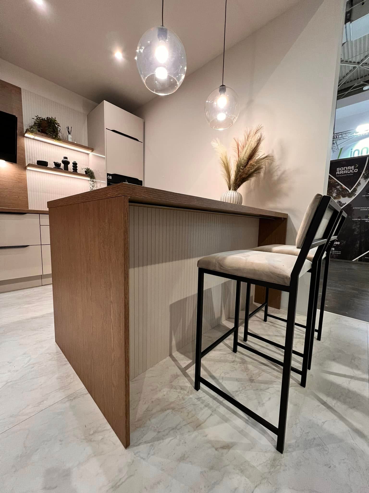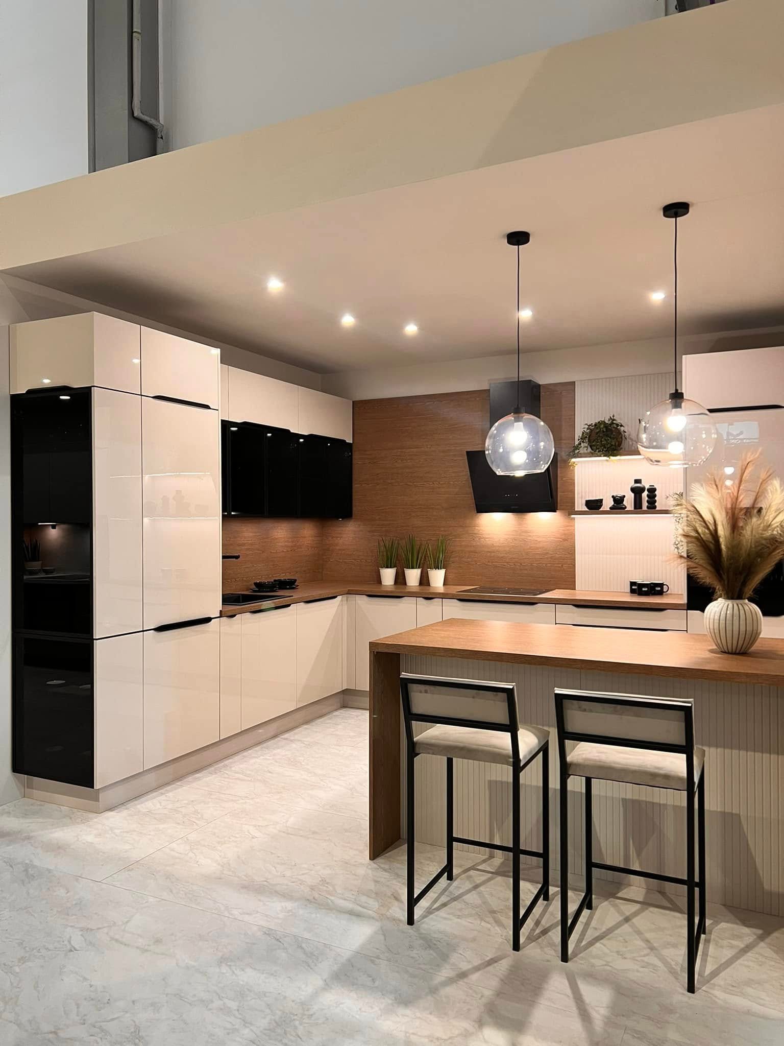 To niebanalne połączenie koloru i wzoru. Kuchnia w ciepłych odcieniach KASZMIRU w połączeniu z pięknym wybarwieniem drewna DĄB BELMONT a to wszystko dopełniają czarne uchwyty krawędziowe zintegrowane z frontem dzięki czemu kuchnia jest niepowtarzalna i piękna oraz zyskuje jakże modny wygląd.