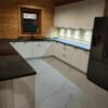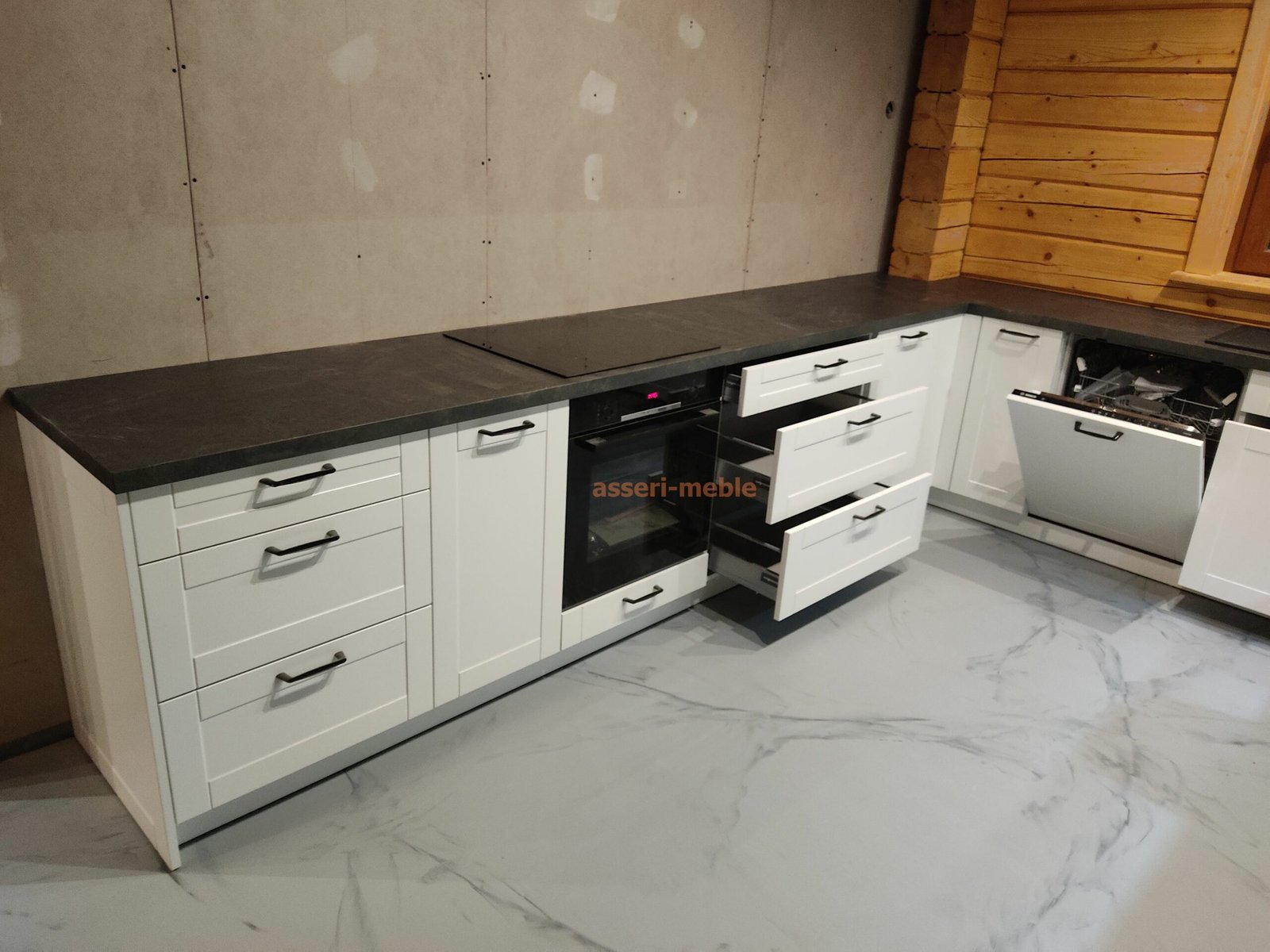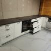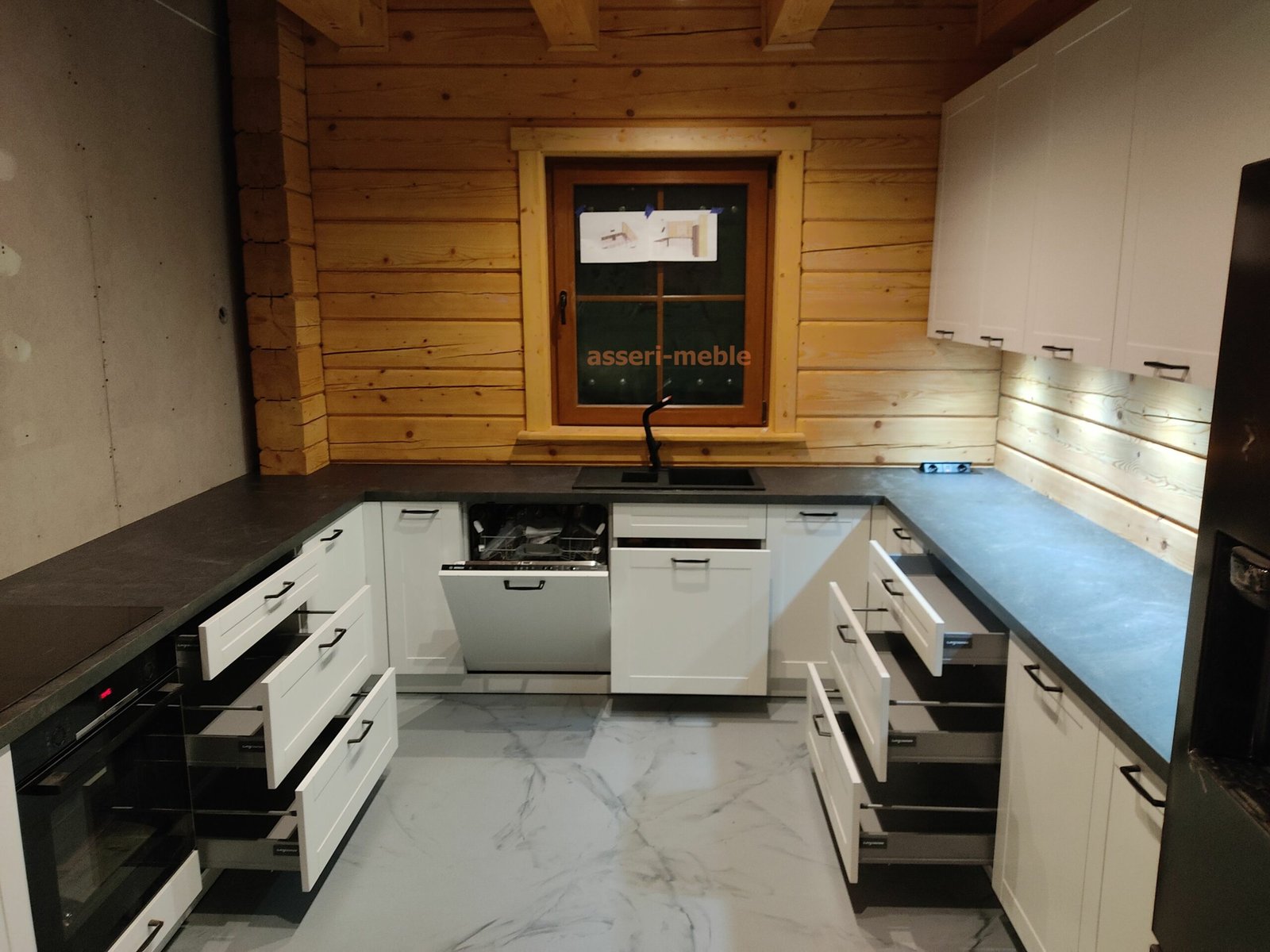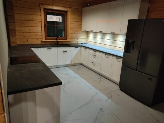 - Fronty lakierowane w kolorze białym (pół-mat) w połączeniu z blatem w kolorze skalnym