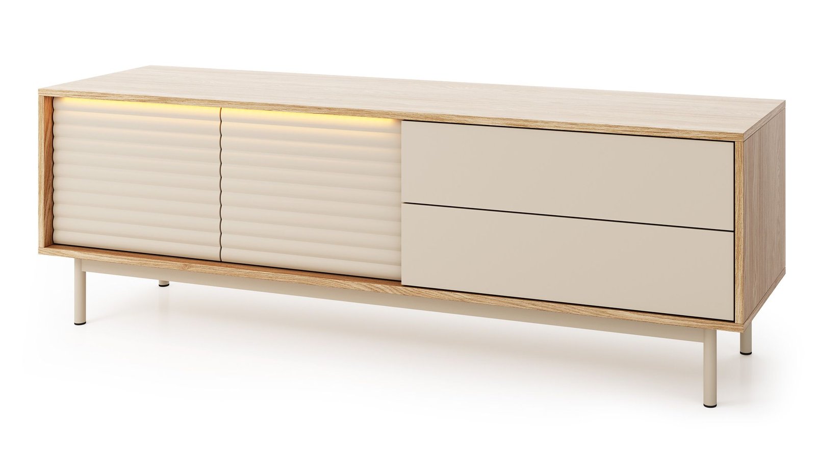 LATI 04 komoda RTV na wysokich nogach z szufladami i podświetleniem 160 cm CASHMERE – DĄB