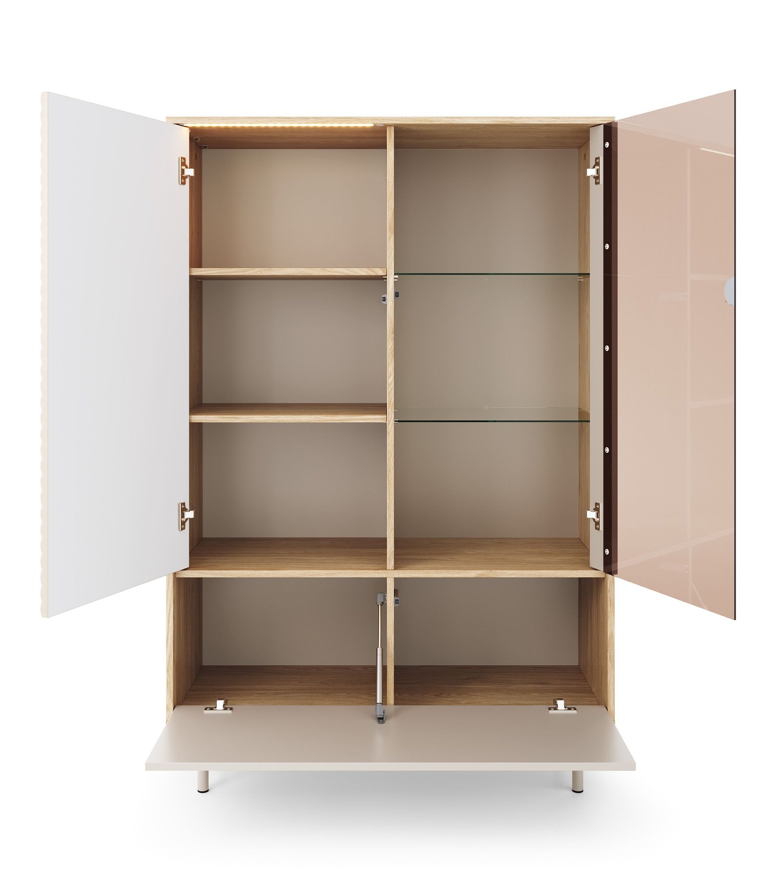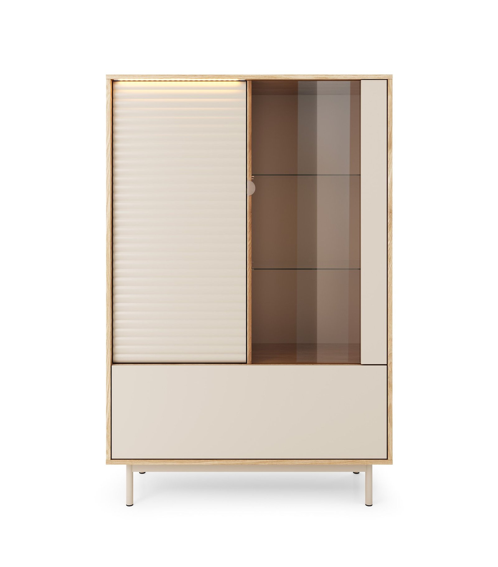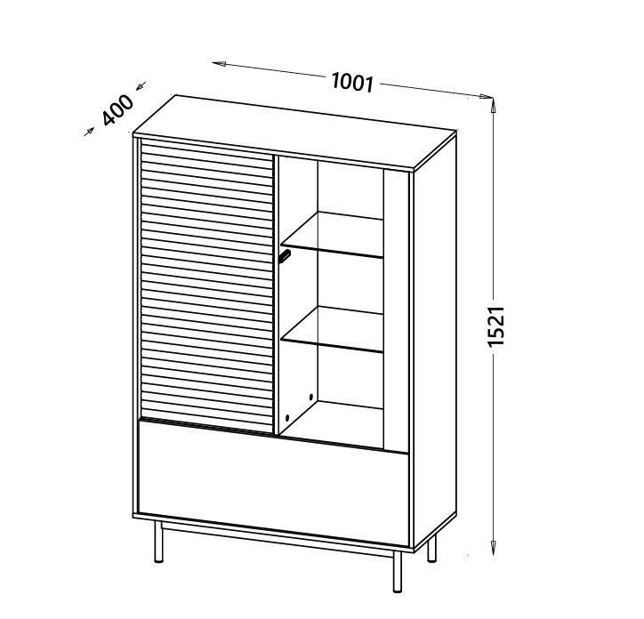 Kolekcja LATI doskonale łączy nowoczesne wzornictwo z funkcjonalnym układem przechowywania. Sprawdzi się doskonale jw jadalni lub jako centrum multimedialne w Twoim salonie. To doskonały wybór dla osób, które cenią design, porządek i wygodę użytkowania. Cała kolekcja wykonana starannie, stylowo wykończona z dbałością o szczegóły. Wyposażona o oświetlenie LED nad drzwiami w standardzie. Opcjonalnie można domówić dodatkowe oświetlenie LED półek szklanych.