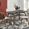 Spiek w kolorze czarnego marmuru to materiał bardzo odporny na zarysowania, uszkodzenia i trwały w użytkowaniu, co sprawia, że stół będzie służył Ci przez długi czas. Czarny marmur dodaje mu prestiżowego charakteru, który z pewnością będzie zachwycał Twoich gości. W dodatku kolor spieku idealnie koresponduje z orzechowym wybarwieniem nóg. Stalowe nogi idealne uzupełnienie całość, dodając stołowi nowoczesnego i designerskiego wyglądu.