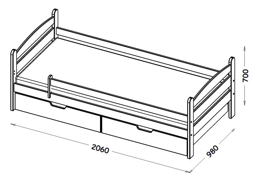 • wymiar łóżka: 98 szer. x 206 dł. x 70 wys.