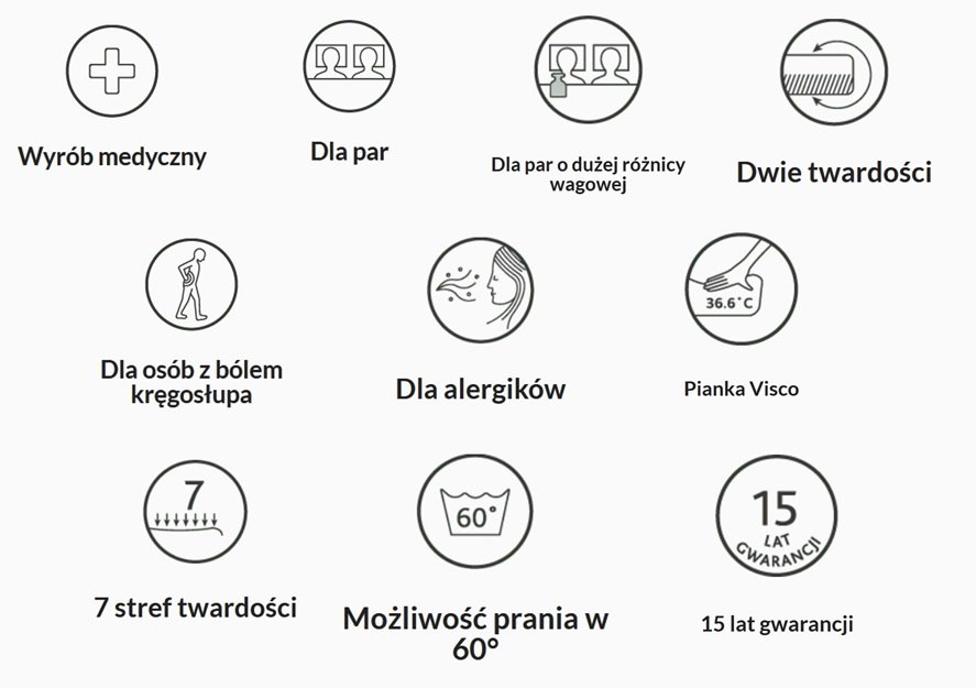 Po jednej stronie wkładu znajduje się płyta z naturalnego lateksu, który zwiększa sprężystość wkładu i ogranicza rozwój mikroflory bakteryjnej. Druga strona wkładu wykorzystuje właściwości termoelastycznej pianki Visco, która dopasowuje się do kształtu ciała, zmniejszając napięcie mięśniowe. Każda ze stron oferuje inny poziom twardości i komfortu.