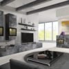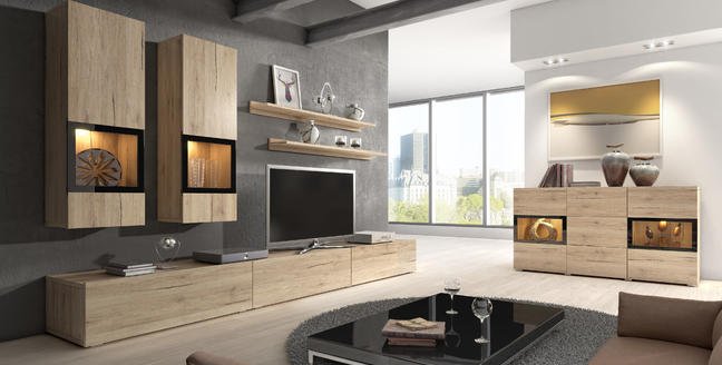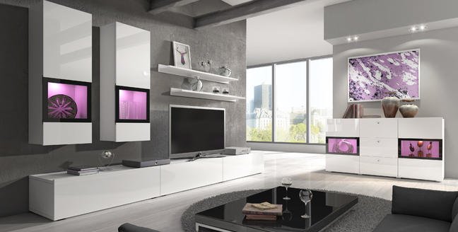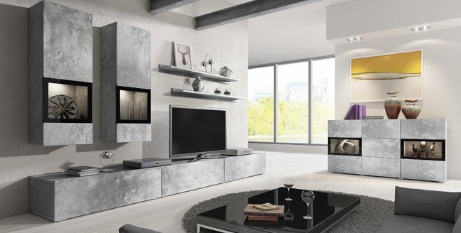Meblościanka  BAROS wykonana jest z płyty w pięciu  atrakcyjnych kolorach: nowoczesnym kolorze jasnego betonu, modnym kolorze dębu San Remo w jasnym odcieniu , w bieli w wysokim połysku , satin orzech oraz schiefer. We wszystkich wariantach ramki w witrynach wykonano lakierując krawędzie powierzchni szklanych w kolorze czarnym. Do dyspozycji Klientów oddajemy dwie wielkości meblościankę o długości 270 cm i zgrabną komodę 2D 3S, stolik kawowy oraz komoda RTV z możliwością powieszenia.