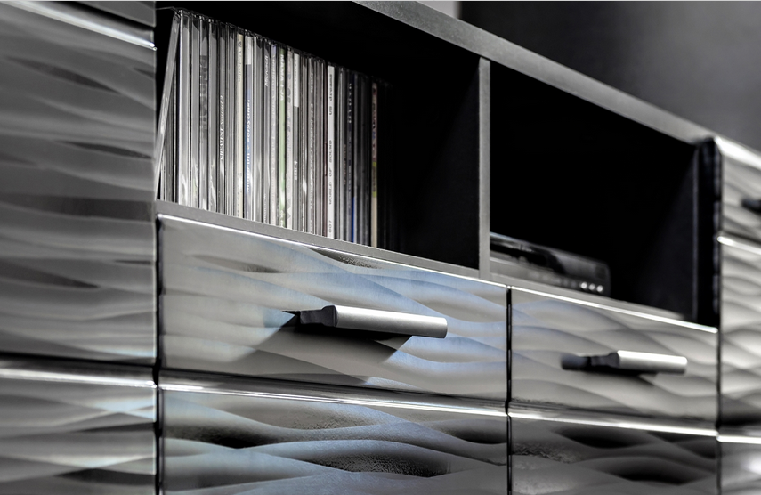 Podstawę oryginalnego wyglądu mebli stanowi nowoczesny dekor 3D, który jest idealnym rozwiązaniem dla wszystkich osób preferujących nowoczesny, a zarazem odważny design.
