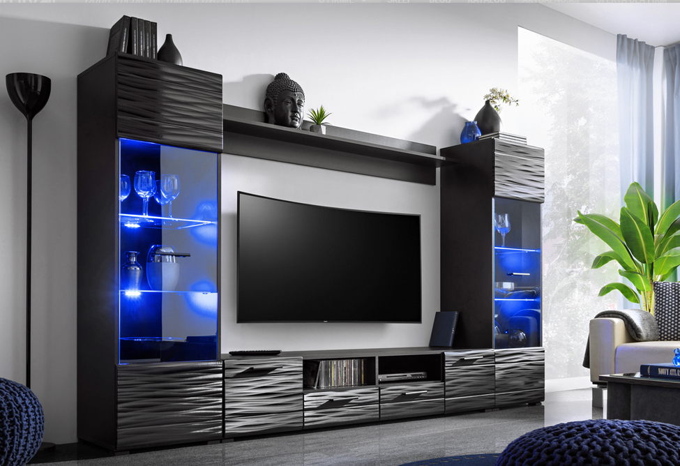 Meblościanka MODICA doskonale wpasuje się do awangardowego salonu, podkreślając niepowtarzalny i unikatowy styl pomieszczenia.