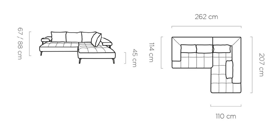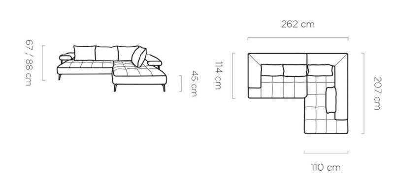 Eleganckie przeszycia dodają narożnikowi wdzięku, a zagłówki umiejscowione na metalowych uchwytach sprawiają, że mebel wyróżnia się swoim wyglądem.
