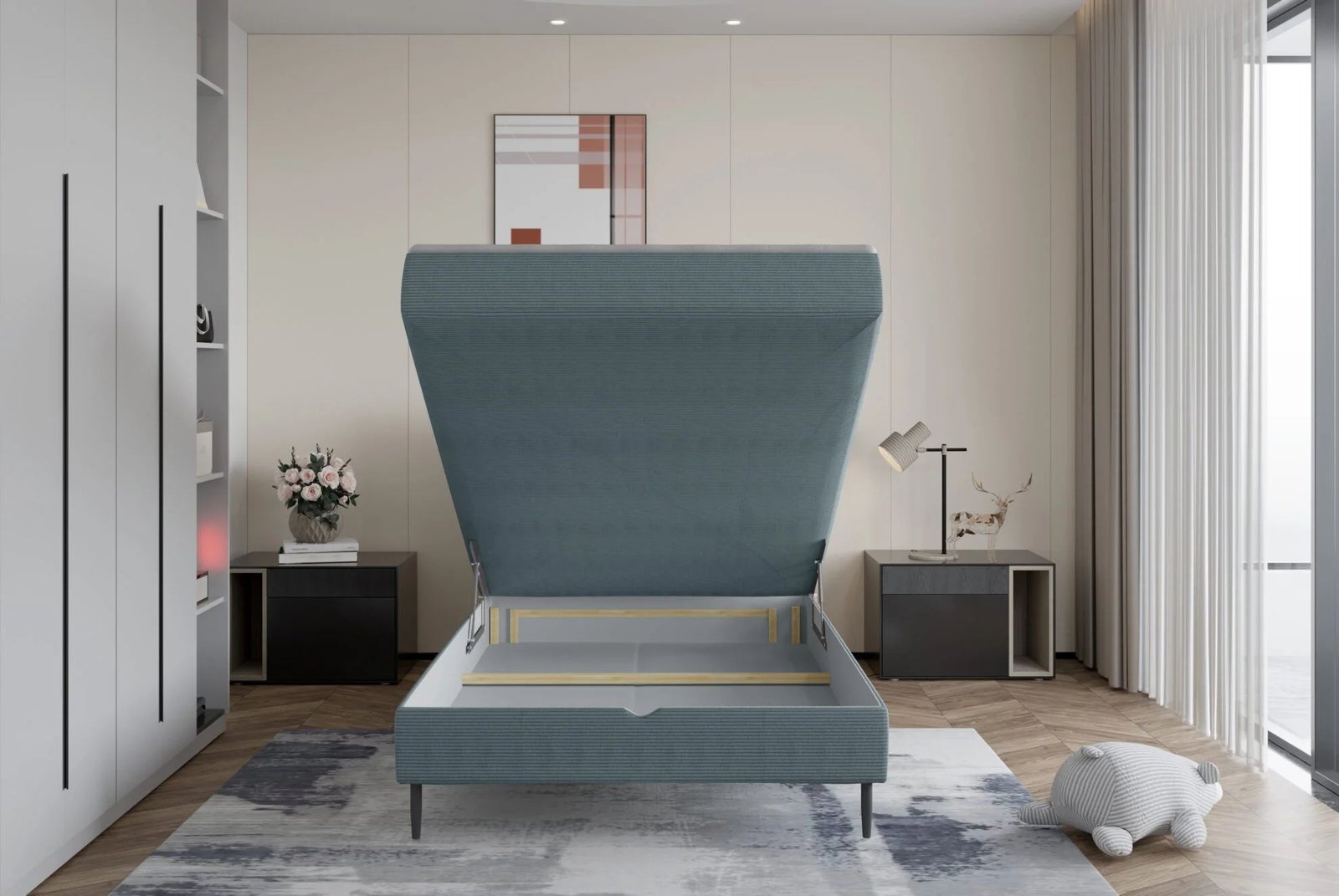 W zestawie z łóżkiem znajduje się podnoszony stelaż, dzięki któremu za pomocą jednego, sprawnego ruchu dostaniesz się do pojemnika na pościel.