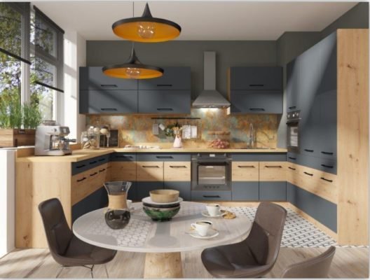 Ciekawą propozycją w kuchni są grafitowo-drewniane fronty a aranżacje w połączeniu z korpusem w kolorze ARTISAN wyglądają elegancko i szykownie.
