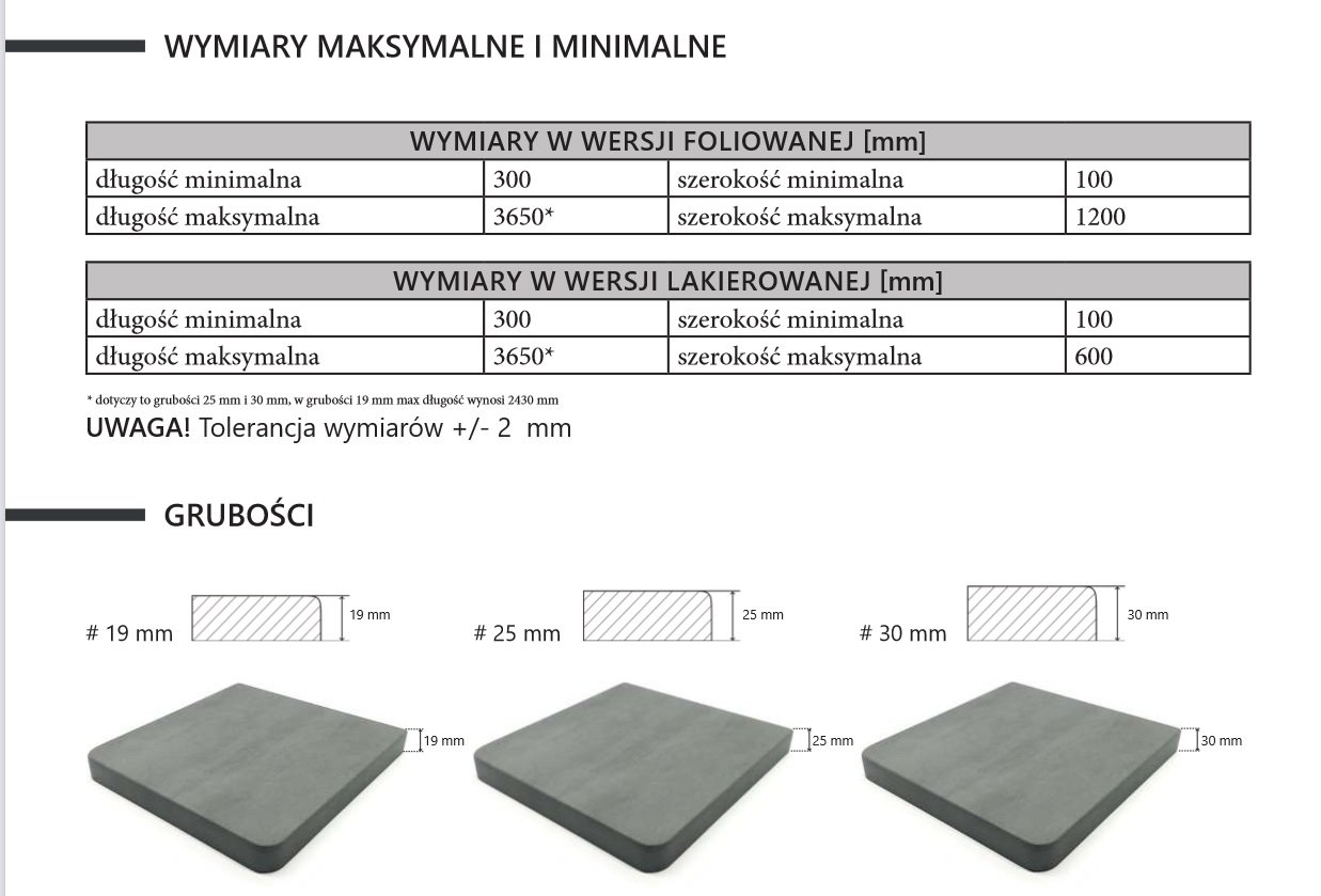 Podana cena dotyczy m2 parapetu foliowanego wykonanego z MDF grubości 30 mm