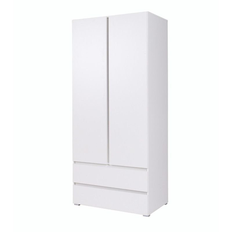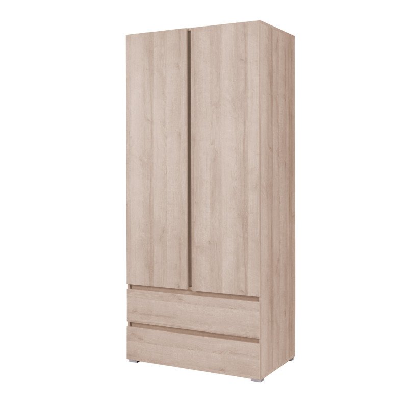 To, co wyróżnia tę szafę dwudrzwiową PIRI, to przemyślany układ wnętrza, który został podzielony na dwie funkcjonalne strefy. Pierwsza przestrzeń wyposażona została wyłącznie w praktyczne półki, idealne do przechowywania złożonych ubrań. Druga część zawiera górną półkę oraz drążek na wieszaki, dzięki czemu doskonale sprawdza się do przechowywania ubrań wiszących – takich jak koszule czy sukienki.