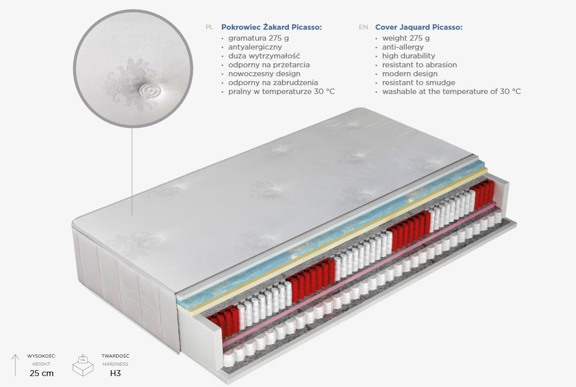 ROYAL is a top-shelf, very luxurious mattress. Thanks to the varied structure of the core, in which there are the highest quality foams of different structure and two layers of springs, the mattress is comfortable, does not compress and minimizes the risk of bedsores. If healthy sleep and, above all, high sleeping comfort is very important to you, the Royal mattress will be an excellent choice.