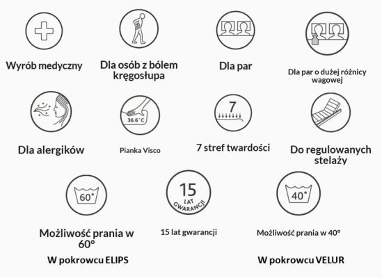 Pokrowiec Elips – wykonany z jedwabistej i miękkiej w dotyku dzianiny Elips. Gwarantuje wysoki stopień elastyczności, dzięki czemu każdorazowo dopasowuje się do ułożenia ciała na całej powierzchni materaca. Wysoka jakość i trwałość zapewnią komfortowy i głęboki sen przez długie lata. Pokrowiec łatwy w utrzymaniu czystości, dzięki możliwości prania w temp. 60oC.